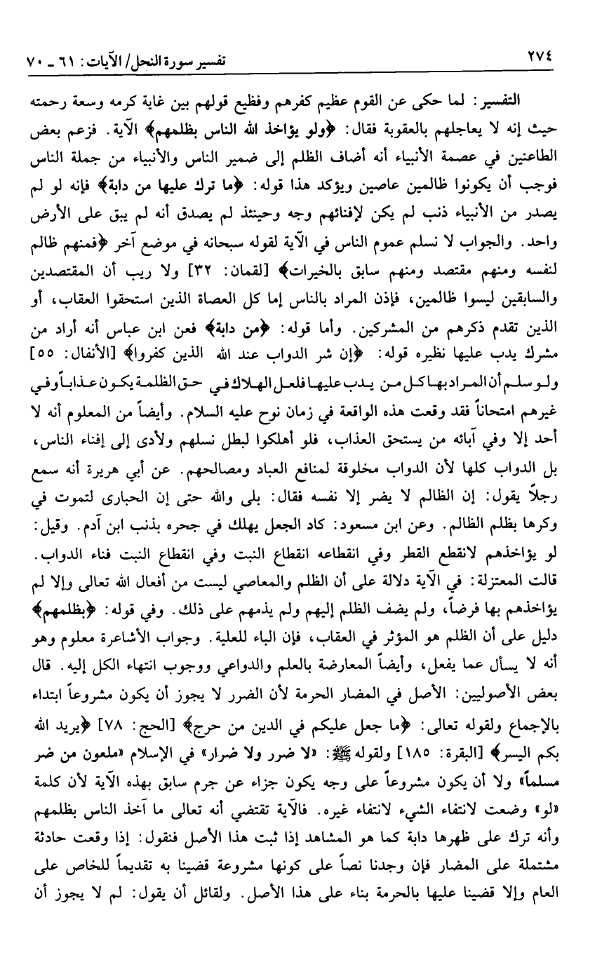 ولا أن يكون مشروعا على وجه يكون جزاء عن جرم سابق بهذه الآية لأن كلمة «لو» وضعت لانتفاء الشيء لانتفاء غيره. فالآية تقتضي أنه تعالى ما آخذ الناس بظلمهم وأنه ترك على ظهرها دابة كما هو المشاهد إذا ثبت هذا الأصل فنقول: إذا وقعت حادثة مشتملة على المضار فإن وجدنا نصا على كونها مشروعة قضينا به تقديما للخاص على العام وإلا قضينا عليها بالحرمة بناء على هذا الأصل. ولقائل أن يقول: لم لا يجوز أن
