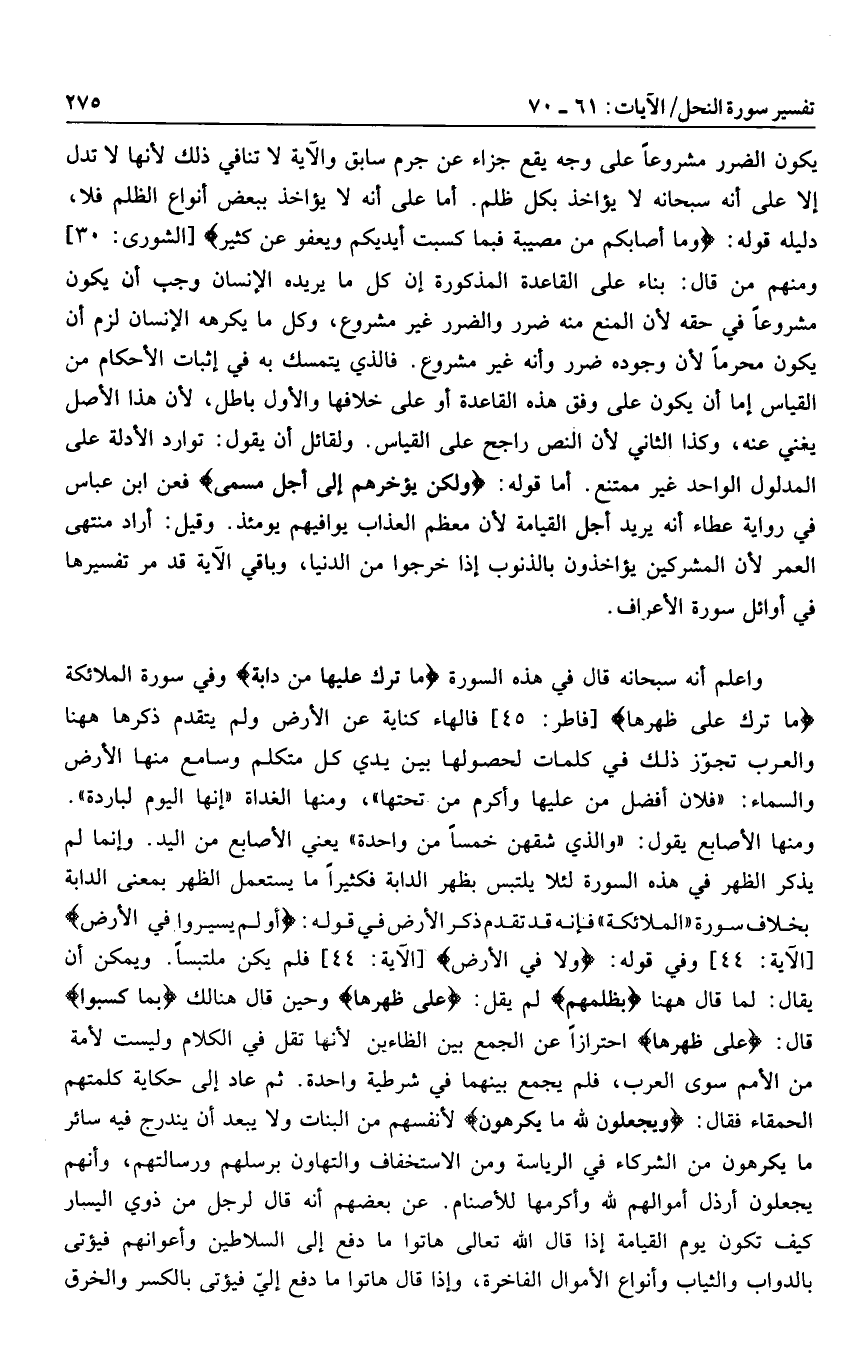 يكون الضرر مشروعا على وجه يقع جزاء عن جرم سابق والآية لا تنافي ذلك لأنها لا تدل إلا على أنه سبحانه لا يؤاخذ بكل ظلم. أما على أنه لا يؤاخذ ببعض أنواع الظلم فلا، دليله قوله: وَما أَصابَكُمْ مِنْ مُصِيبَةٍ فَبِما كَسَبَتْ أَيْدِيكُمْ وَيَعْفُوا عَنْ كَثِيرٍ [الشورى: 30] ومنهم من قال: بناء على القاعدة المذكورة إن كل ما يريده الإنسان وجب أن يكون مشروعا في حقه لأن المنع منه ضرر والضرر غير مشروع، وكل ما يكرهه الإنسان لزم أن يكون محرما لأن وجوده ضرر وأنه غير مشروع. فالذي يتمسك به في إثبات الأحكام من القياس إما أن يكون على وفق هذه القاعدة أو على خلافها والأول باطل، لأن هذا الأصل يغني عنه، وكذا الثاني لأن النص راجح على القياس. ولقائل أن يقول: توارد الأدلة على المدلول الواحد غير ممتنع. أما قوله: وَلكِنْ يُؤَخِّرُهُمْ إِلى أَجَلٍ مُسَمًّى فعن ابن عباس في رواية عطاء أنه يريد أجل القيامة لأن معظم العذاب يوافيهم يومئذ. وقيل: أراد منتهى العمر لأن المشركين يؤاخذون بالذنوب إذا خرجوا من الدنيا، وباقي الآية قد مر تفسيرها في أوائل سورة الأعراف.