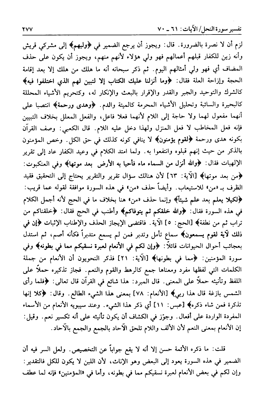 لِكَيْ لا يَعْلَمَ بَعْدَ عِلْمٍ شَيْئاً وإنما حذف «من» هنا بخلاف ما في الحج لأنه أجمل الكلام في هذه السورة فقال: وَاللَّهُ خَلَقَكُمْ ثُمَّ يَتَوَفَّاكُمْ وأطنب في الحج فقال: خَلَقْناكُمْ مِنْ تُرابٍ ثُمَّ مِنْ نُطْفَةٍ [الحج: 5] الآية. فاقتضى الإيجاز الحذف والإطناب الإثبات إِنَّ فِي ذلِكَ لَآيَةً لِقَوْمٍ يَسْمَعُونَ سماع تأمل وتدبر فمن لم يسمع متدبرا فكأنه أصم، ثم استدل بعجائب أحوال الحيوانات قائلا: وَإِنَّ لَكُمْ فِي الْأَنْعامِ لَعِبْرَةً نُسْقِيكُمْ مِمَّا فِي بُطُونِهِ وفي سورة المؤمنين: مِمَّا فِي بُطُونِها [الآية: 21] فذكر النحويون أن الأنعام من جملة الكلمات التي لفظها مفرد ومعناها جمع كالرهط والقوم والنعم. فجاز تذكيره حملا على اللفظ وتأنيثه حملا على المعنى. قال المبرد: هذا شائع في القرآن قال تعالى: فَلَمَّا رَأَى الشَّمْسَ بازِغَةً قالَ هذا رَبِّي [الأنعام: 78] بمعنى هذا الشيء الطالع. وقال: كَلَّا إِنَّها تَذْكِرَةٌ فَمَنْ شاءَ ذَكَرَهُ [عبس: 11] أي ذكر هذا الشيء. وعند سيبويه الأنعام من الأسماء المفردة الواردة على أفعال. وجوّز في الكشاف أن يكون تأنيثه على أنه تكسير نعم. وقيل: