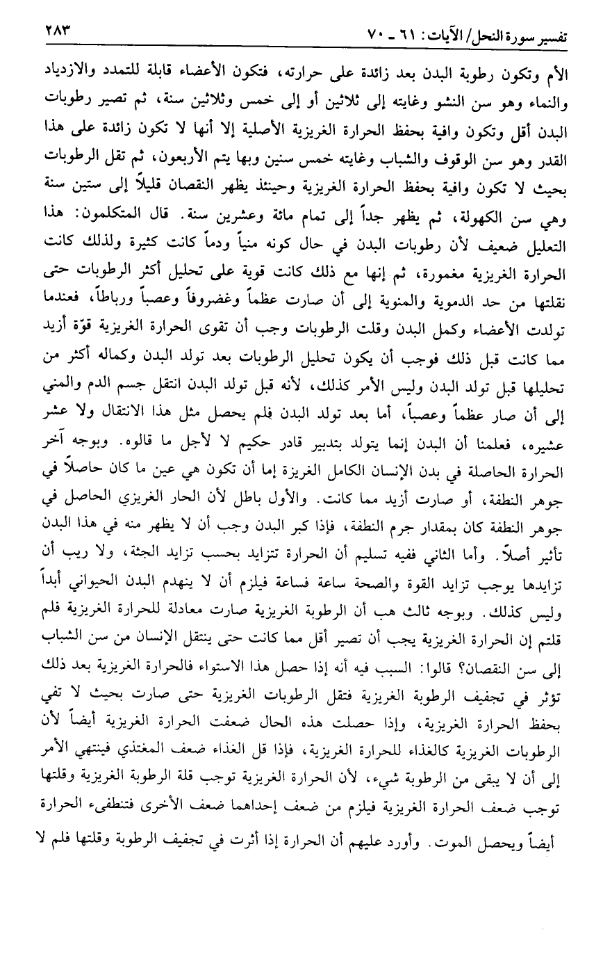 الأم وتكون رطوبة البدن بعد زائدة على حرارته، فتكون الأعضاء قابلة للتمدد والازدياد والنماء وهو سن النشو وغايته إلى ثلاثين أو إلى خمس وثلاثين سنة، ثم تصير رطوبات البدن أقل وتكون وافية بحفظ الحرارة الغريزية الأصلية إلا أنها لا تكون زائدة على هذا القدر وهو سن الوقوف والشباب وغايته خمس سنين وبها يتم الأربعون، ثم تقل الرطوبات بحيث لا تكون وافية بحفظ الحرارة الغريزية وحينئذ يظهر النقصان قليلا إلى ستين سنة وهي سن الكهولة، ثم يظهر جدا إلى تمام مائة وعشرين سنة. قال المتكلمون: هذا التعليل ضعيف لأن رطوبات البدن في حال كونه منيا ودما كانت كثيرة ولذلك كانت الحرارة الغريزية مغمورة، ثم إنها مع ذلك كانت قوية على تحليل أكثر الرطوبات حتى نقلتها من حد الدموية والمنوية إلى أن صارت عظما وغضروفا وعصبا ورباطا، فعند ما تولدت الأعضاء وكمل البدن وقلت الرطوبات وجب أن تقوى الحرارة الغريزية قوّة أزيد مما كانت قبل ذلك فوجب أن يكون تحليل الرطوبات بعد تولد البدن وكماله أكثر من تحليلها قبل تولد البدن وليس الأمر كذلك، لأنه قبل تولد البدن انتقل جسم الدم والمني إلى أن صار عظما وعصبا، أما بعد تولد البدن فلم يحصل مثل هذا الانتقال ولا عشر عشيره، فعلمنا أن البدن إنما يتولد بتدبير قادر حكيم لا لأجل ما قالوه. وبوجه آخر الحرارة الحاصلة في بدن الإنسان الكامل الغريزة إما أن تكون هي عين ما كان حاصلا في جوهر النطفة، أو صارت أزيد مما كانت. والأول باطل لأن الحار الغريزي الحاصل في جوهر النطفة، كان بمقدار جرم النطفة، فإذا كبر البدن وجب أن لا يظهر منه في هذا البدن تأثير أصلا. وأما الثاني ففيه تسليم أن الحرارة تتزايد بحسب تزايد الجثة، ولا ريب أن تزايدها يوجب تزايد القوة والصحة ساعة فساعة فيلزم أن لا ينهدم البدن الحيواني أبدا وليس كذلك. وبوجه ثالث هب أن الرطوبة الغريزية صارت معادلة للحرارة الغريزية فلم قلتم إن الحرارة الغريزية يجب أن تصير أقل مما كانت حتى ينتقل الإنسان من سن الشباب إلى سن النقصان؟ قالوا: السبب فيه أنه إذا حصل هذا الاستواء فالحرارة الغريزية بعد ذلك تؤثر في تجفيف الرطوبة الغريزية فتقل الرطوبات الغريزية حتى صارت بحيث لا تفي بحفظ الحرارة الغريزية، وإذا حصلت هذه الحال ضعفت الحرارة الغريزية أيضا لأن الرطوبات الغريزية كالغذاء للحرارة الغريزية، فإذا قل الغذاء ضعف المغتذي فينتهي الأمر إلى أن لا يبقى من الرطوبة شيء، لأن الحرارة الغريزية توجب قلة الرطوبة الغريزية وقلتها توجب ضعف الحرارة الغريزية فيلزم من ضعف إحداهما ضعف الأخرى فتنطفىء الحرارة أيضا ويحصل الموت. وأورد عليهم أن الحرارة إذا أثرت في تجفيف الرطوبة وقلتها فلم لا
