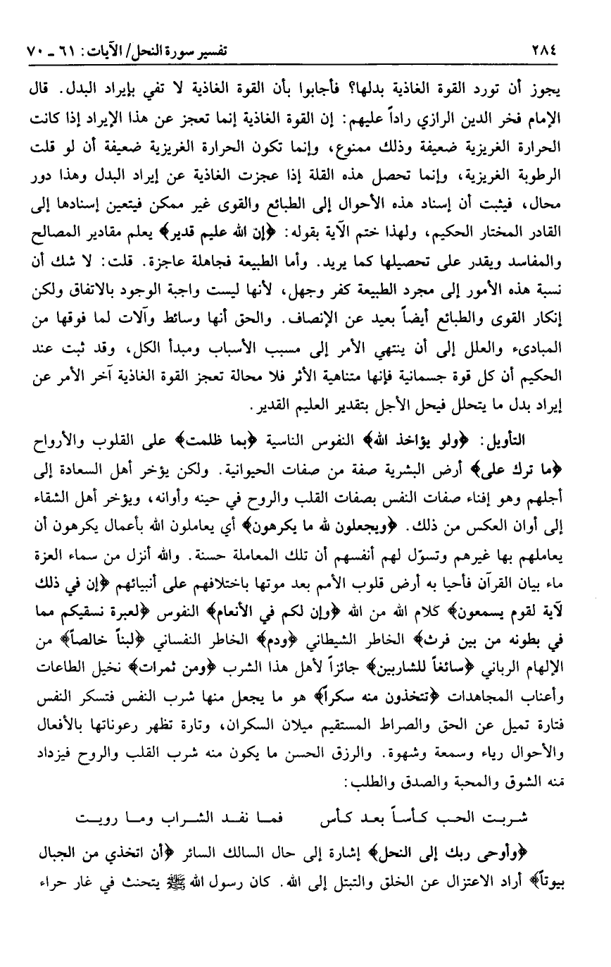 وَلَوْ يُؤاخِذُ اللَّهُ النفوس الناسية بما ظلمت على القلوب والأرواح ما تَرَكَ عَلى أرض البشرية صفة من صفات الحيوانية. ولكن يؤخر أهل السعادة إلى أجلهم وهو إفناء صفات النفس بصفات القلب والروح في حينه وأوانه، ويؤخر أهل الشقاء إلى أوان العكس من ذلك. وَيَجْعَلُونَ لِلَّهِ ما يَكْرَهُونَ أي يعاملون الله بأعمال يكرهون أن يعاملهم بها غيرهم وتسوّل لهم أنفسهم أن تلك المعاملة حسنة. والله أنزل من سماء العزة ماء بيان القرآن فأحيا به أرض قلوب الأمم بعد موتها باختلافهم على أنبيائهم إِنَّ فِي ذلِكَ لَآيَةً لِقَوْمٍ يَسْمَعُونَ كلام الله من الله وَإِنَّ لَكُمْ فِي الْأَنْعامِ النفوس لَعِبْرَةً نُسْقِيكُمْ مِمَّا فِي بُطُونِهِ مِنْ بَيْنِ فَرْثٍ الخاطر الشيطاني وَدَمٍ الخاطر النفساني لَبَناً خالِصاً من الإلهام الرباني سائِغاً لِلشَّارِبِينَ جائزا لأهل هذا الشرب وَمِنْ ثَمَراتِ نخيل الطاعات وأعناب المجاهدات تَتَّخِذُونَ مِنْهُ سَكَراً هو ما يجعل منها شرب النفس فتسكر النفس فتارة تميل عن الحق والصراط المستقيم ميلان السكران، وتارة تظهر رعوناتها بالأفعال والأحوال رياء وسمعة وشهوة. والرزق الحسن ما يكون منه شرب القلب والروح فيزداد منه الشوق والمحبة والصدق والطلب: