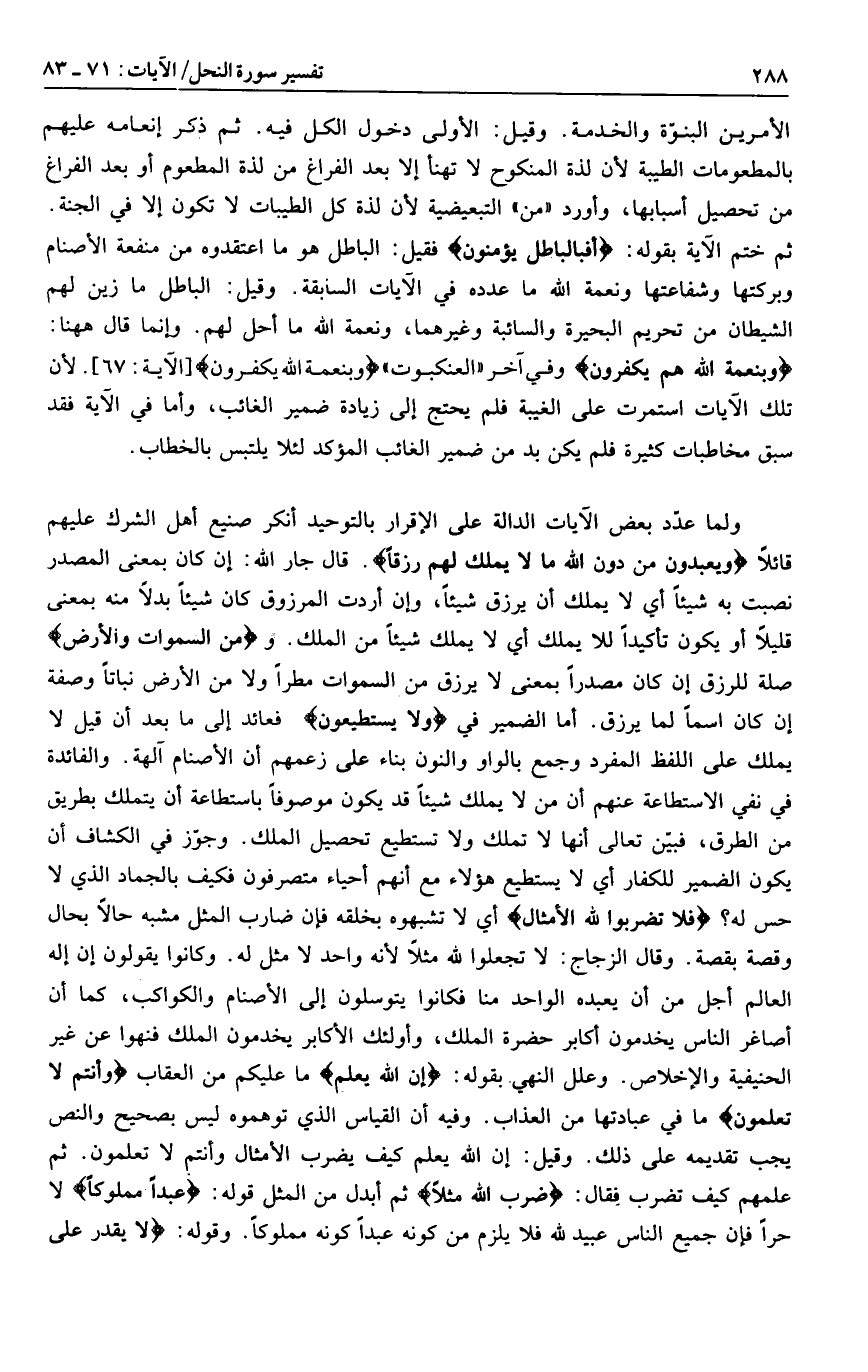 ولما عدّد بعض الآيات الدالة على الإقرار بالتوحيد أنكر صنيع أهل الشرك عليهم قائلا وَيَعْبُدُونَ مِنْ دُونِ اللَّهِ ما لا يَمْلِكُ لَهُمْ رِزْقاً. قال جار الله: إن كان بمعنى المصدر نصبت به شيئا أي لا يملك أن يرزق شيئا، وإن أردت المرزوق كان شيئا بدلا منه بمعنى قليلا أو يكون تأكيدا للا يملك أي لا يملك شيئا من الملك. ومِنَ السَّماواتِ وَالْأَرْضِ صلة للرزق إن كان مصدرا بمعنى لا يرزق من السموات مطرا ولا من الأرض نباتا وصفة إن كان اسما لما يرزق. أما الضمير في وَلا يَسْتَطِيعُونَ فعائد إلى ما بعد أن قيل لا يملك على اللفظ المفرد وجمع بالواو والنون بناء على زعمهم أن الأصنام آلهة. والفائدة في نفي الاستطاعة عنهم أن من لا يملك شيئا قد يكون موصوفا باستطاعة أن يتملك بطريق من الطرق، فبيّن تعالى أنها لا تملك ولا تستطيع تحصيل الملك. وجوّز في الكشاف أن يكون الضمير للكفار أي لا يستطيع هؤلاء مع أنهم أحياء متصرفون فكيف بالجماد الذي لا حس له؟ فَلا تَضْرِبُوا لِلَّهِ الْأَمْثالَ أي لا تشبهوه بخلقه فإن ضارب المثل مشبه حالا بحال وقصة بقصة. وقال الزجاج: لا تجعلوا لله مثلا لأنه واحد لا مثل له. وكانوا يقولون إن إله العالم أجل من أن يعبده الواحد منا فكانوا يتوسلون إلى الأصنام والكواكب، كما أن أصاغر الناس يخدمون أكابر حضرة الملك، وأولئك الأكابر يخدمون الملك فنهوا عن غير الحنيفية والإخلاص. وعلل النهي بقوله: إِنَّ اللَّهَ يَعْلَمُ ما عليكم من العقاب وَأَنْتُمْ لا تَعْلَمُونَ ما في عبادتها من العذاب. وفيه أن القياس الذي توهموه ليس بصحيح والنص يجب تقديمه على ذلك. وقيل: إن الله يعلم كيف يضرب الأمثال وأنتم لا تعلمون. ثم علمهم كيف تضرب فقال: ضَرَبَ اللَّهُ مَثَلًا ثم أبدل من المثل قوله: عَبْداً مَمْلُوكاً لا حرا فإن جميع الناس عبيد لله فلا يلزم من كونه عبدا كونه مملوكا. وقوله: لا يَقْدِرُ عَلى
