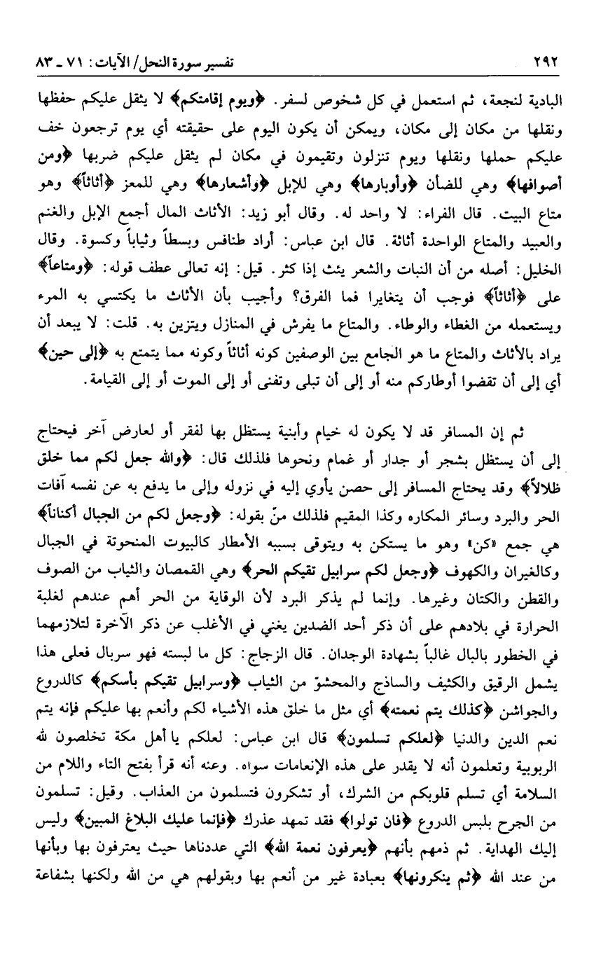 البادية لنجعة، ثم استعمل في كل شخوص لسفر. وَيَوْمَ إِقامَتِكُمْ لا يثقل عليكم حفظها ونقلها من مكان إلى مكان، ويمكن أن يكون اليوم على حقيقته أي يوم ترجعون خف عليكم حملها ونقلها ويوم تنزلون وتقيمون في مكان لم يثقل عليكم ضربها وَمِنْ أَصْوافِها وهي للضأن وَأَوْبارِها وهي للإبل وَأَشْعارِها وهي للمعز أَثاثاً وهو متاع البيت. قال الفراء: لا واحد له. وقال أبو زيد: الأثاث المال أجمع الإبل والغنم والعبيد والمتاع الواحدة أثاثة. قال ابن عباس: أراد طنافس وبسطا وثيابا وكسوة. وقال الخليل: أصله من أن النبات والشعر يئث إذا كثر. قيل: إنه تعالى عطف قوله: وَمَتاعاً على أَثاثاً فوجب أن يتغايرا فما الفرق؟ وأجيب بأن الأثاث ما يكتسي به المرء ويستعمله من الغطاء والوطاء. والمتاع ما يفرش في المنازل ويتزين به. قلت: لا يبعد أن يراد بالأثاث والمتاع ما هو الجامع بين الوصفين كونه أثاثا وكونه مما يتمتع به إِلى حِينٍ أي إلى أن تقضوا أوطاركم منه أو إلى أن تبلى وتفنى أو إلى الموت أو إلى القيامة.
