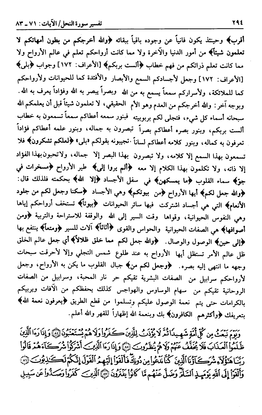 وحينئذ يكون فانيا عن وجوده باقيا ببقائه وَاللَّهُ أَخْرَجَكُمْ مِنْ بُطُونِ أُمَّهاتِكُمْ لا تَعْلَمُونَ شَيْئاً من أمور الدنيا والآخرة ولا مما كانت أرواحكم تعلم في عالم الأرواح ولا مما كانت تعلم ذراتكم من فهم خطاب أَلَسْتُ بِرَبِّكُمْ [الأعراف: 172] وجواب بَلى [الأعراف: 172] وجعل لأجسادكم السمع والأبصار والأفئدة كما للحيوانات ولأرواحكم كما للملائكة، ولأسراركم سمعا يسمع به من الله وبصرا يبصر به الله وفؤادا يعرف به الله سبحانه أسماء كل شيء، فتجلى لكم بربوبيته فبنور سمعه أعطاكم سمعا تسمعون به خطاب ألست بربكم، وبنور بصره أعطاكم بصرا تبصرون به جماله، وبنور علمه أعطاكم فؤادا تعرفون به كماله، وبنور كلامه أعطاكم لسانا تجيبونه بقولكم «بلى» لَعَلَّكُمْ تَشْكُرُونَ فلا تسمعون بهذا السمع إلا كلامه، ولا تبصرون بهذا البصر إلا جماله، ولا تحبون بهذا الفؤاد إلا ذاته، ولا تكلمون بهذا الكلام إلا معه أَلَمْ يَرَوْا إِلَى طير الأرواح مُسَخَّراتٍ فِي جَوِّ سماء القلوب ما يُمْسِكُهُنَّ في سفل الأجساد إِلَّا اللَّهُ بحكمته فلذلك قال: