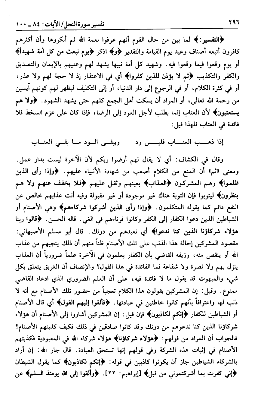 ومعنى «ثم» أن المنع من الكلام أصعب من شهادة الأنبياء عليهم. وَإِذا رَأَى الَّذِينَ ظَلَمُوا وهم المشركون الْعَذابَ بعينهم وثقل عليهم فَلا يُخَفَّفُ عَنْهُمْ وَلا هُمْ يُنْظَرُونَ ليتوبوا فإن التوبة هناك غير موجودة أو غير مقبولة وفيه أنت عذابهم خالص عن النفع دائم كما يقوله المتكلمون. وَإِذا رَأَى الَّذِينَ أَشْرَكُوا شُرَكاءَهُمْ وهي الأصنام أو الشياطين الذين دعوا الكفار إلى الكفر وكانوا قرناءهم في الغي. قاله الحسن. قالُوا رَبَّنا هؤُلاءِ شُرَكاؤُنَا الَّذِينَ كُنَّا نَدْعُوا أي نعبدهم من دونك. قال أبو مسلم الأصبهاني: