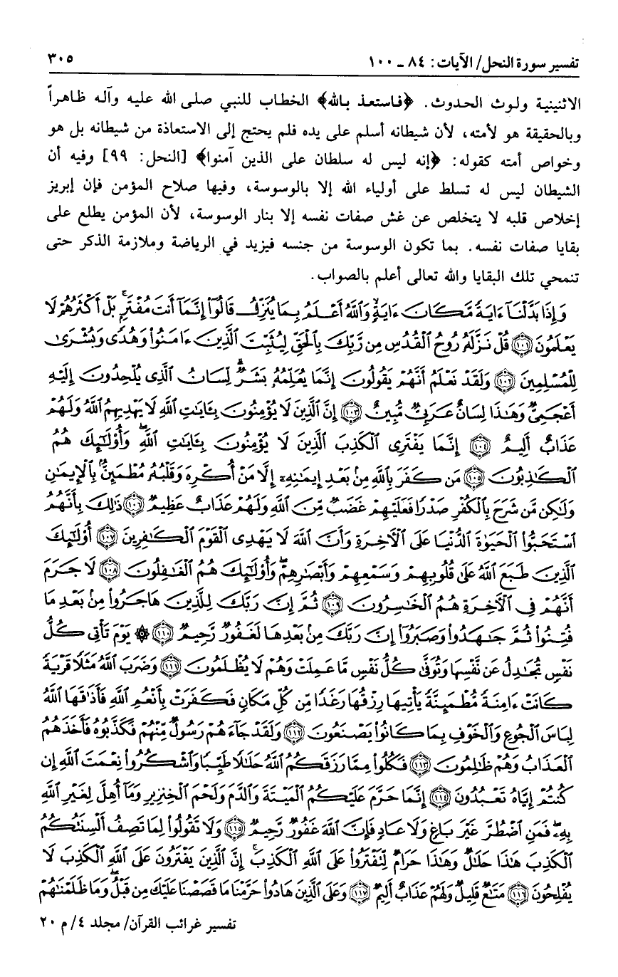 وَإِذا بَدَّلْنا آيَةً مَكانَ آيَةٍ وَاللَّهُ أَعْلَمُ بِما يُنَزِّلُ قالُوا إِنَّما أَنْتَ مُفْتَرٍ بَلْ أَكْثَرُهُمْ لا يَعْلَمُونَ (101) قُلْ نَزَّلَهُ رُوحُ الْقُدُسِ مِنْ رَبِّكَ بِالْحَقِّ لِيُثَبِّتَ الَّذِينَ آمَنُوا وَهُدىً وَبُشْرى لِلْمُسْلِمِينَ (102) وَلَقَدْ نَعْلَمُ أَنَّهُمْ يَقُولُونَ إِنَّما يُعَلِّمُهُ بَشَرٌ لِسانُ الَّذِي يُلْحِدُونَ إِلَيْهِ أَعْجَمِيٌّ وَهذا لِسانٌ عَرَبِيٌّ مُبِينٌ (103) إِنَّ الَّذِينَ لا يُؤْمِنُونَ بِآياتِ اللَّهِ لا يَهْدِيهِمُ اللَّهُ وَلَهُمْ عَذابٌ أَلِيمٌ (104) إِنَّما يَفْتَرِي الْكَذِبَ الَّذِينَ لا يُؤْمِنُونَ بِآياتِ اللَّهِ وَأُولئِكَ هُمُ الْكاذِبُونَ (105)