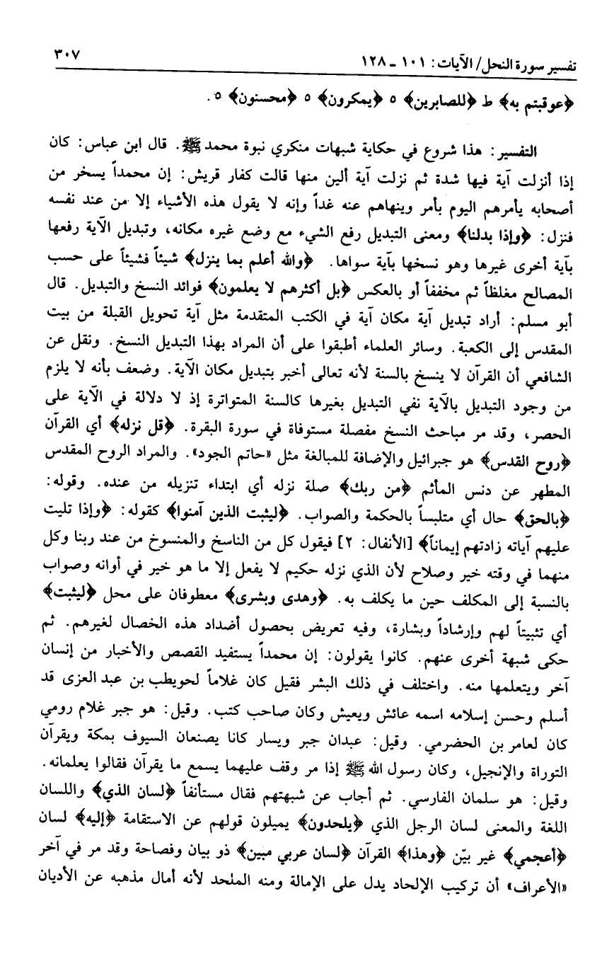 بِالْحَقِّ حال أي متلبسا بالحكمة والصواب. لِيُثَبِّتَ الَّذِينَ آمَنُوا كقوله: وَإِذا تُلِيَتْ عَلَيْهِمْ آياتُهُ زادَتْهُمْ إِيماناً [الأنفال: 2] فيقول كل من الناسخ والمنسوخ من عند ربنا وكل منهما في وقته خير وصلاح لأن الذي نزله حكيم لا يفعل إلا ما هو خير في أوانه وصواب بالنسبة إلى المكلف حين ما يكلف به. وَهُدىً وَبُشْرى معطوفان على محل لِيُثَبِّتَ أي تثبيتا لهم وإرشادا وبشارة، وفيه تعريض بحصول أضداد هذه الخصال لغيرهم. ثم حكى شبهة أخرى عنهم. كانوا يقولون: إن محمدا يستفيد القصص والأخبار من إنسان آخر ويتعلمها منه. واختلف في ذلك البشر فقيل كان غلاما لحويطب بن عبد العزى قد أسلم وحسن إسلامه اسمه عائش ويعيش وكان صاحب كتب. وقيل: هو جبر غلام رومي كان لعامر بن الحضرمي. وقيل: عبدان جبر ويسار كانا يصنعان السيوف بمكة ويقرآن التوراة والإنجيل، وكان رسول الله صلى الله عليه وسلم إذا مر وقف عليهما يسمع ما يقرآن فقالوا يعلمانه.