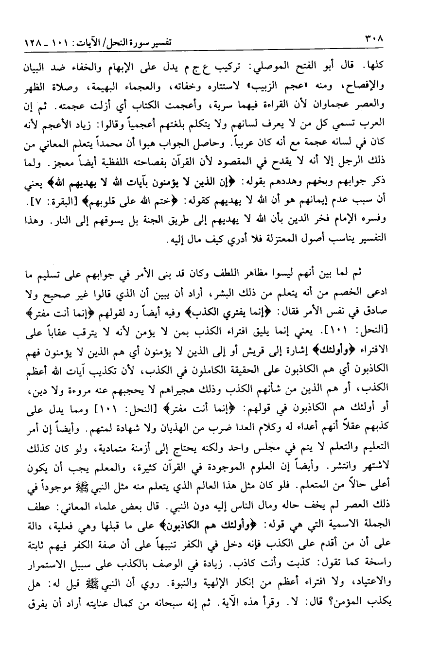كلها. قال أبو الفتح الموصلي: تركيب ع ج م يدل على الإبهام والخفاء ضد البيان والإفصاح، ومنه «عجم الزبيب» لاستتاره وخفاته، والعجماء البهيمة، وصلاة الظهر والعصر عجماوان لأن القراءة فيهما سرية، وأعجمت الكتاب أي أزلت عجمته. ثم إن العرب تسمي كل من لا يعرف لسانهم ولا يتكلم بلغتهم أعجميا وقالوا: زياد الأعجم لأنه كان في لسانه عجمة مع أنه كان عربيا. وحاصل الجواب هبوا أن محمدا يتعلم المعاني من ذلك الرجل إلا أنه لا يقدح في المقصود لأن القرآن بفصاحته اللفظية أيضا معجز. ولما ذكر جوابهم وبخهم وهددهم بقوله: إِنَّ الَّذِينَ لا يُؤْمِنُونَ بِآياتِ اللَّهِ لا يَهْدِيهِمُ اللَّهُ يعني أن سبب عدم إيمانهم هو أن الله لا يهديهم كقوله: خَتَمَ اللَّهُ عَلى قُلُوبِهِمْ [البقرة: 7] .