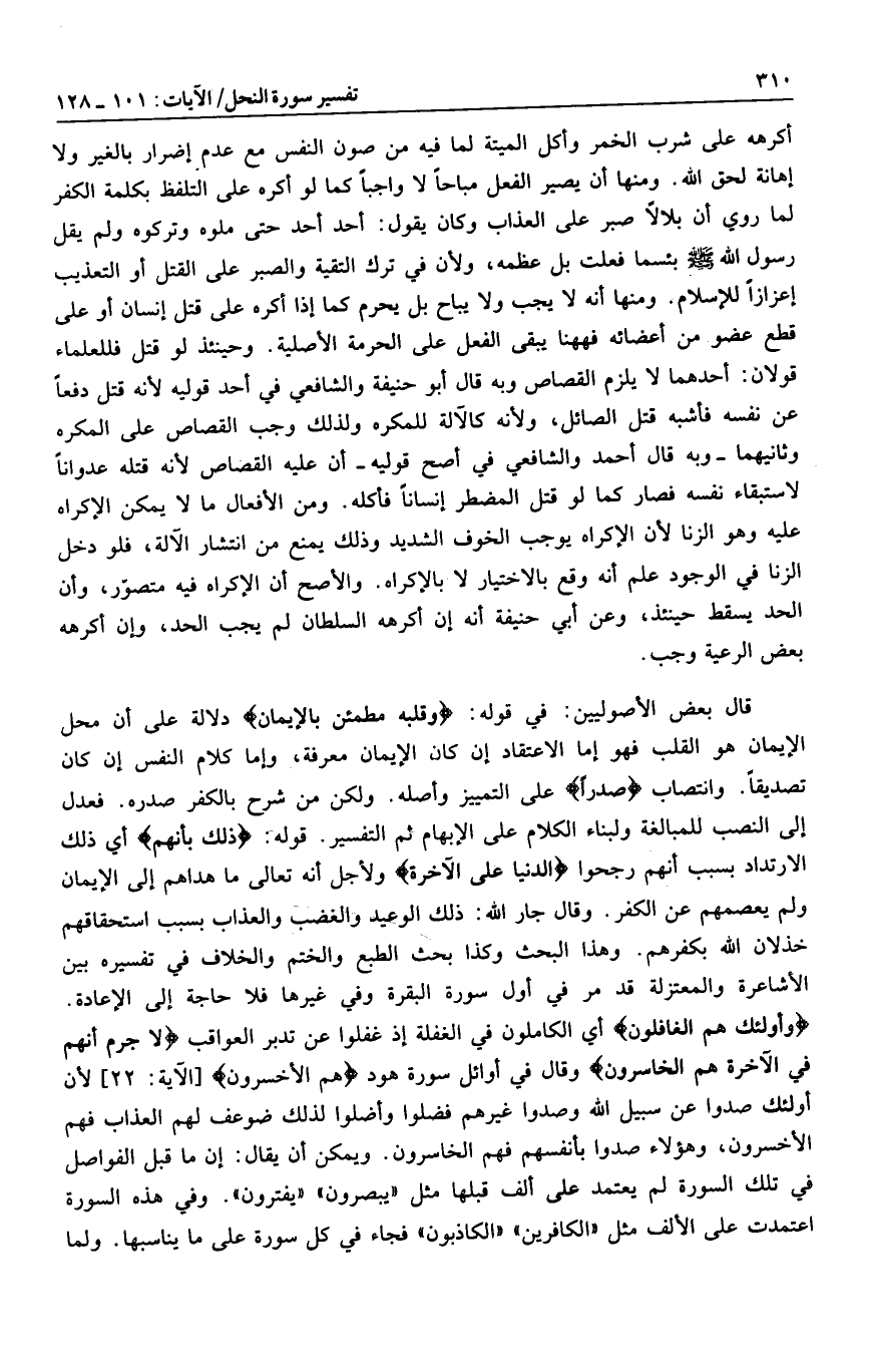 قال بعض الأصوليين: في قوله: وَقَلْبُهُ مُطْمَئِنٌّ بِالْإِيمانِ دلالة على أن محل الإيمان هو القلب فهو إما الاعتقاد إن كان الإيمان معرفة، وإما كلام النفس إن كان تصديقا. وانتصاب صَدْراً على التمييز وأصله. ولكن من شرح بالكفر صدره. فعدل إلى النصب للمبالغة ولبناء الكلام على الإبهام ثم التفسير. قوله: ذلِكَ بِأَنَّهُمُ أي ذلك الارتداد بسبب أنهم رجحوا الدُّنْيا عَلَى الْآخِرَةِ ولأجل أنه تعالى ما هداهم إلى الإيمان ولم يعصمهم عن الكفر. وقال جار الله: ذلك الوعيد والغضب والعذاب بسبب استحقاقهم خذلان الله بكفرهم. وهذا البحث وكذا بحث الطبع والختم والخلاف في تفسيره بين الأشاعرة والمعتزلة قد مر في أول سورة البقرة وفي غيرها فلا حاجة إلى الإعادة.
