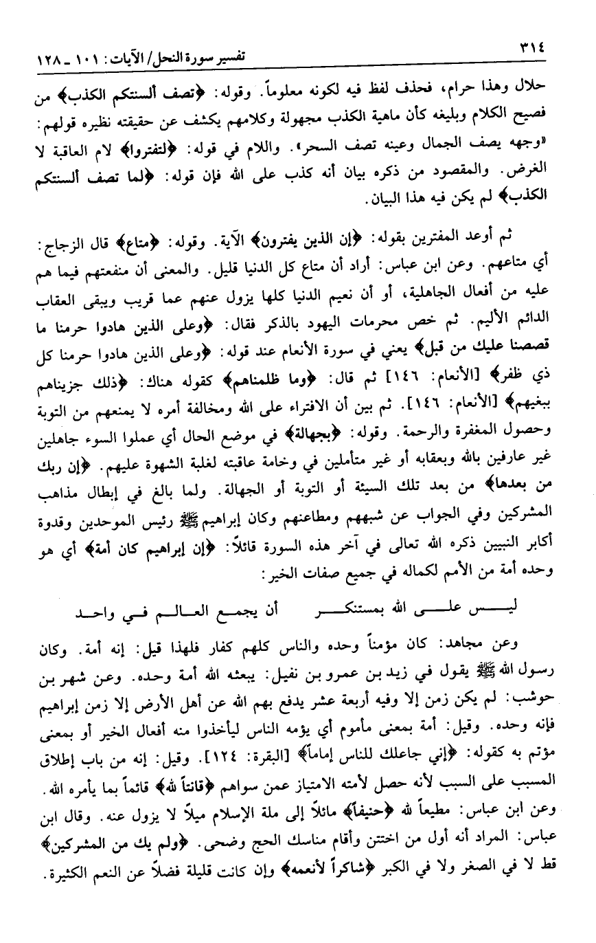 أي متاعهم. وعن ابن عباس: أراد أن متاع كل الدنيا قليل. والمعنى أن منفعتهم فيما هم عليه من أفعال الجاهلية، أو أن نعيم الدنيا كلها يزول عنهم عما قريب ويبقى العقاب الدائم الأليم. ثم خص محرمات اليهود بالذكر فقال: وَعَلَى الَّذِينَ هادُوا حَرَّمْنا ما قَصَصْنا عَلَيْكَ مِنْ قَبْلُ يعني في سورة الأنعام عند قوله: وَعَلَى الَّذِينَ هادُوا حَرَّمْنا كُلَّ ذِي ظُفُرٍ [الأنعام: 146] ثم قال: وَما ظَلَمْناهُمْ كقوله هناك: ذلِكَ جَزَيْناهُمْ بِبَغْيِهِمْ [الأنعام: 146] . ثم بين أن الافتراء على الله ومخالفة أمره لا يمنعهم من التوبة وحصول المغفرة والرحمة. وقوله: بِجَهالَةٍ في موضع الحال أي عملوا السوء جاهلين غير عارفين بالله وبعقابه أو غير متأملين في وخامة عاقبته لغلبة الشهوة عليهم. إِنَّ رَبَّكَ مِنْ بَعْدِها من بعد تلك السيئة أو التوبة أو الجهالة. ولما بالغ في إبطال مذاهب المشركين وفي الجواب عن شبههم ومطاعنهم وكان إبراهيم صلى الله عليه وسلم رئيس الموحدين وقدوة أكابر النبيين ذكره الله تعالى في آخر هذه السورة قائلا: إِنَّ إِبْراهِيمَ كانَ أُمَّةً أي هو وحده أمة من الأمم لكماله في جميع صفات الخير:
