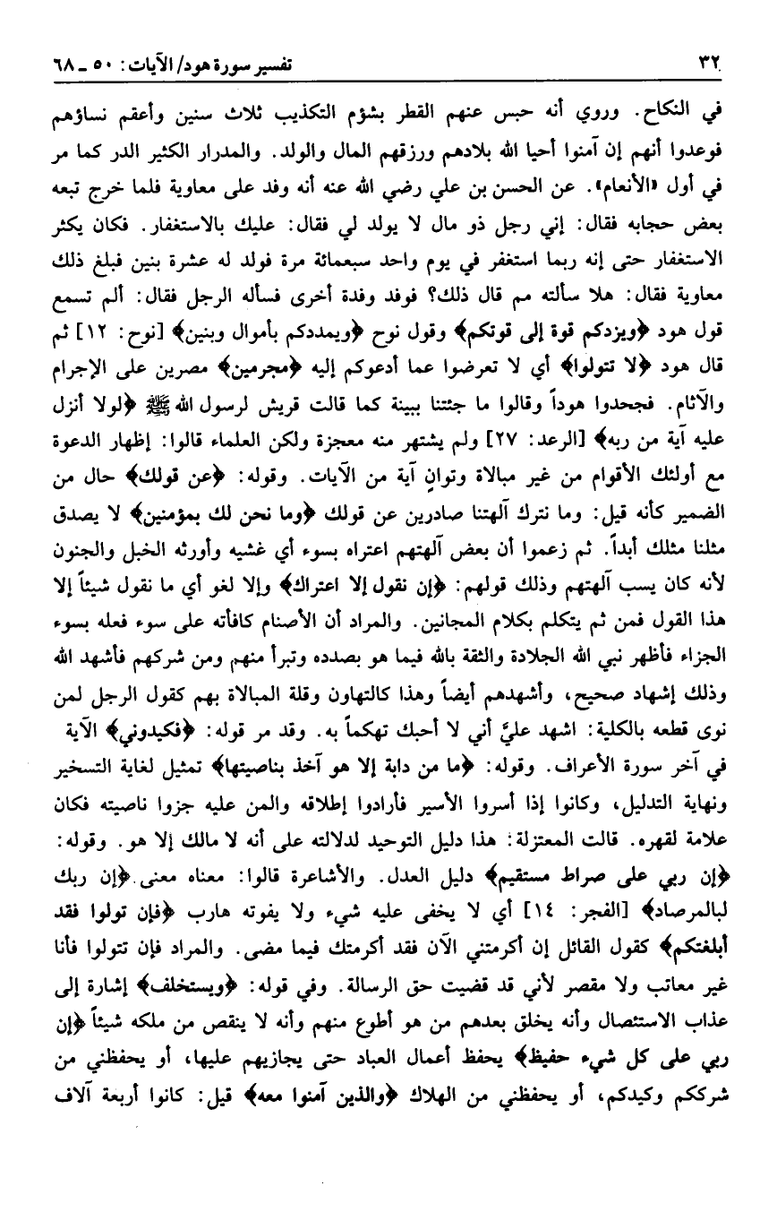 ثم قال هود لا تَتَوَلَّوْا أي لا تعرضوا عما أدعوكم إليه مُجْرِمِينَ مصرين على الإجرام والآثام. فجحدوا هودا وقالوا ما جئتنا ببينة كما قالت قريش لرسول الله صلى الله عليه وسلم لَوْلا أُنْزِلَ عَلَيْهِ آيَةٌ مِنْ رَبِّهِ [الرعد: 27] ولم يشتهر منه معجزة ولكن العلماء قالوا: إظهار الدعوة مع أولئك الأقوام من غير مبالاة وتوان آية من الآيات. وقوله: عَنْ قَوْلِكَ حال من الضمير كأنه قيل: وما نترك آلهتنا صادرين عن قولك وَما نَحْنُ لَكَ بِمُؤْمِنِينَ لا يصدق مثلنا مثلك أبدا. ثم زعموا أن بعض آلهتهم اعتراه بسوء أي غشيه وأورثه الخبل والجنون لأنه كان يسب آلهتهم وذلك قولهم: إِنْ نَقُولُ إِلَّا اعْتَراكَ وإلا لغو أي ما نقول شيئا إلا هذا القول فمن ثم يتكلم بكلام المجانين. والمراد أن الأصنام كافأته على سوء فعله بسوء الجزاء فأظهر نبي الله الجلادة والثقة بالله فيما هو بصدده وتبرأ منهم ومن شركهم فأشهد الله وذلك إشهاد صحيح، وأشهدهم أيضا وهذا كالتهاون وقلة المبالاة بهم كقول الرجل لمن نوى قطعه بالكلية: اشهد عليّ أني لا أحبك تهكما به. وقد مر قوله: فَكِيدُونِي الآية في آخر سورة الأعراف. وقوله: ما مِنْ دَابَّةٍ إِلَّا هُوَ آخِذٌ بِناصِيَتِها تمثيل لغاية التسخير ونهاية التدليل، وكانوا إذا أسروا الأسير فأرادوا إطلاقه والمن عليه جزوا ناصيته فكان علامة لقهره. قالت المعتزلة: هذا دليل التوحيد لدلالته على أنه لا مالك إلا هو. وقوله: