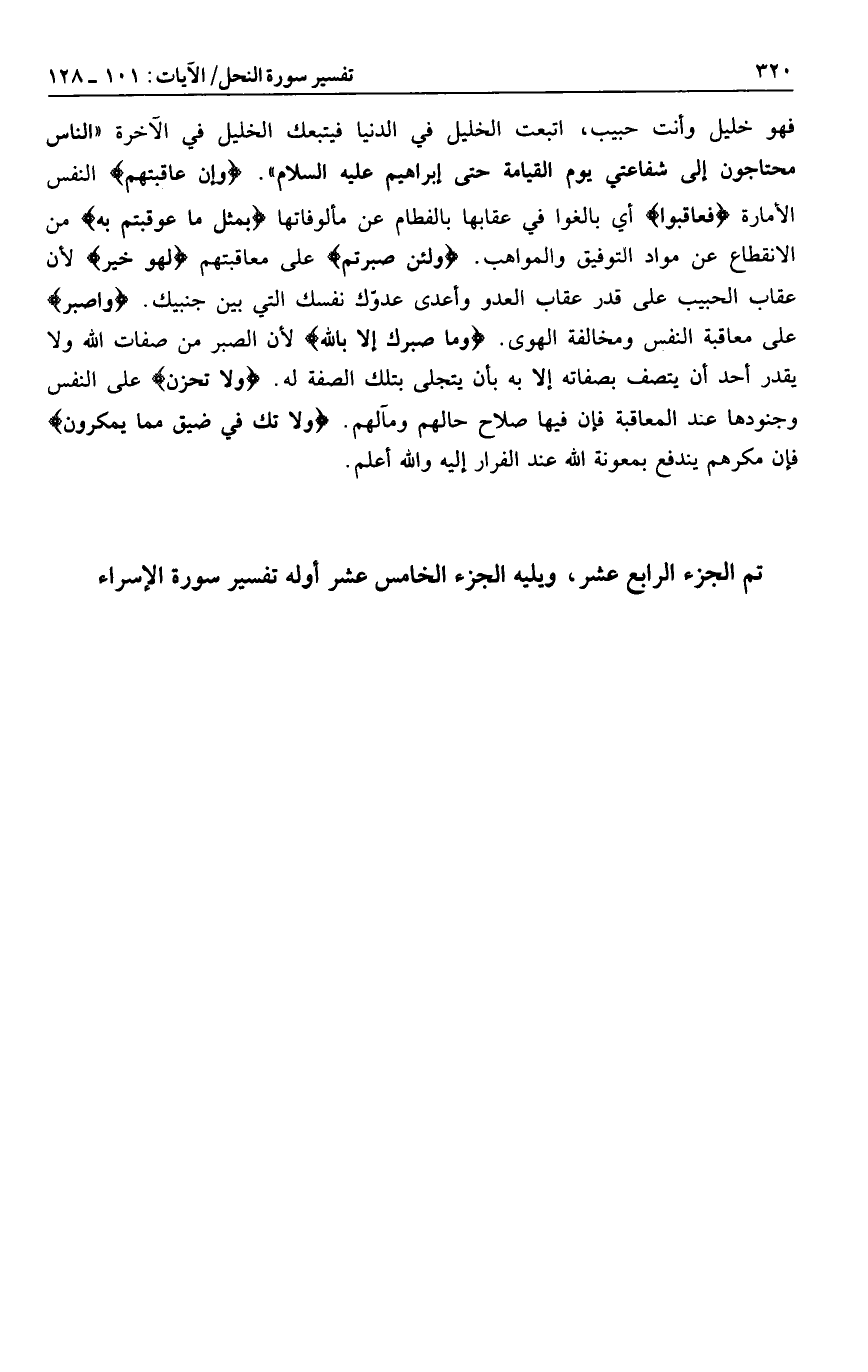 تم الجزء الرابع عشر، ويليه الجزء الخامس عشر أوله تفسير سورة الإسراء