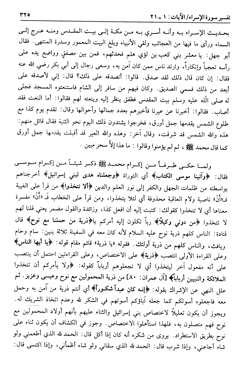 ولما حكى طرفا من إكرام محمد صلى الله عليه وسلم ذكر شيئا من إكرام موسى فقال: وَآتَيْنا مُوسَى الْكِتابَ أي التوراة وَجَعَلْناهُ هُدىً لِبَنِي إِسْرائِيلَ أخرجناهم بواسطته من ظلمات الجهل والكفر إلى نور العلم والدين أَلَّا تَتَّخِذُوا من قرأ على الغيبة ف «أن» ناصبة ولام العاقبة محذوفة أي لئلا يتخذوا، ومن قرأ على الخطاب ف «أن» مفسرة معناها أي لا تتخذوا كقولك: كتبت إليه أن افعل كذا، وزائدة والقول مضمر يعني قلنا لهم لا تتخذوا مِنْ دُونِي وَكِيلًا ربا تكلون إليه أمركم يا ذُرِّيَّةَ مَنْ حَمَلْنا مَعَ نُوحٍ قال قتادة: الناس كلهم ذرية نوح عليه السلام لأنه كان معه في السفينة ثلاثة بنين: سام وحام ويافث، والناس كلهم من ذرية أولئك. فقوله «يا ذرية» قائم مقام قوله: يا أيها الناس وعلى القراءة الأولى انتصب ذُرِّيَّةَ على الاختصاص، وعلى القراءتين احتمل أن ينتصب على أنه مفعول آخر ليتخذوا أي لا تجعلوهم أربابا كقوله: وَلا يَأْمُرَكُمْ أَنْ تَتَّخِذُوا الْمَلائِكَةَ وَالنَّبِيِّينَ أَرْباباً [آل عمران: 80] من ذرية المحمولين مع نوح وعيسى وعزيز. ثم علل النهي عن الإشراك بقوله: إِنَّهُ كانَ عَبْداً شَكُوراً أي أنتم ذرية من آمن به وحمل معه فاجعلوه أسوتكم كما جعله آباؤكم أسوتهم في الشكر لله وعدم اتخاذ الشريك له.