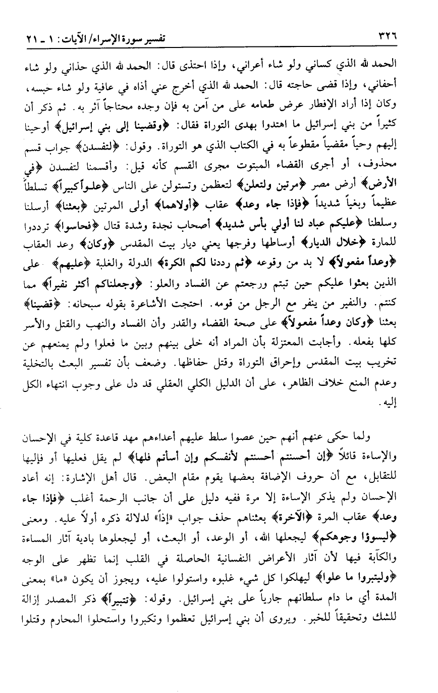 ثم ذكر أن كثيرا من بني إسرائيل ما اهتدوا بهدى التوراة فقال: وَقَضَيْنا إِلى بَنِي إِسْرائِيلَ أوحينا إليهم وحيا مقضيا مقطوعا به في الكتاب الذي هو التوراة وقول: لَتُفْسِدُنَّ جواب قسم محذوف، أو أجرى القضاء المبتوت مجرى القسم كأنه قيل: وأقسمنا لتفسدن فِي الْأَرْضِ أرض مصر مَرَّتَيْنِ وَلَتَعْلُنَّ لتعظمن وتستولن على الناس عُلُوًّا كَبِيراً تسلطا عظيما وبغيا شديدا فَإِذا جاءَ وَعْدُ عقاب أُولاهُما أولى المرتين بَعَثْنا أرسلنا وسلطنا عَلَيْكُمْ عِباداً لَنا أُولِي بَأْسٍ شَدِيدٍ أصحاب نجدة وشدة قتال فَجاسُوا ترددوا للمارة خِلالَ الدِّيارِ أوساطها وفرجها يعني ديار بيت المقدس وَكانَ وعد العقاب وَعْداً مَفْعُولًا لا بد من وقوعه ثُمَّ رَدَدْنا لَكُمُ الْكَرَّةَ الدولة والغلبة عَلَيْهِمْ على الذين بعثوا عليكم حين تبتم ورجعتم عن الفساد والعلو: وَجَعَلْناكُمْ أَكْثَرَ نَفِيراً مما كنتم. والنفير من ينفر مع الرجل من قومه. احتجت الأشاعرة بقوله سبحانه: قَضَيْنا بعثنا وَكانَ وَعْداً مَفْعُولًا على صحة القضاء والقدر وأن الفساد والنهب والقتل والأسر كلها بفعله. وأجابت المعتزلة بأن المراد أنه خلى بينهم وبين ما فعلوا ولم يمنعهم عن تخريب بيت المقدس وإحراق التوراة وقتل حفاظها. وضعف بأن تفسير البعث بالتخلية وعدم المنع خلاف الظاهر، على أن الدليل الكلي العقلي قد دل على وجوب انتهاء الكل إليه.