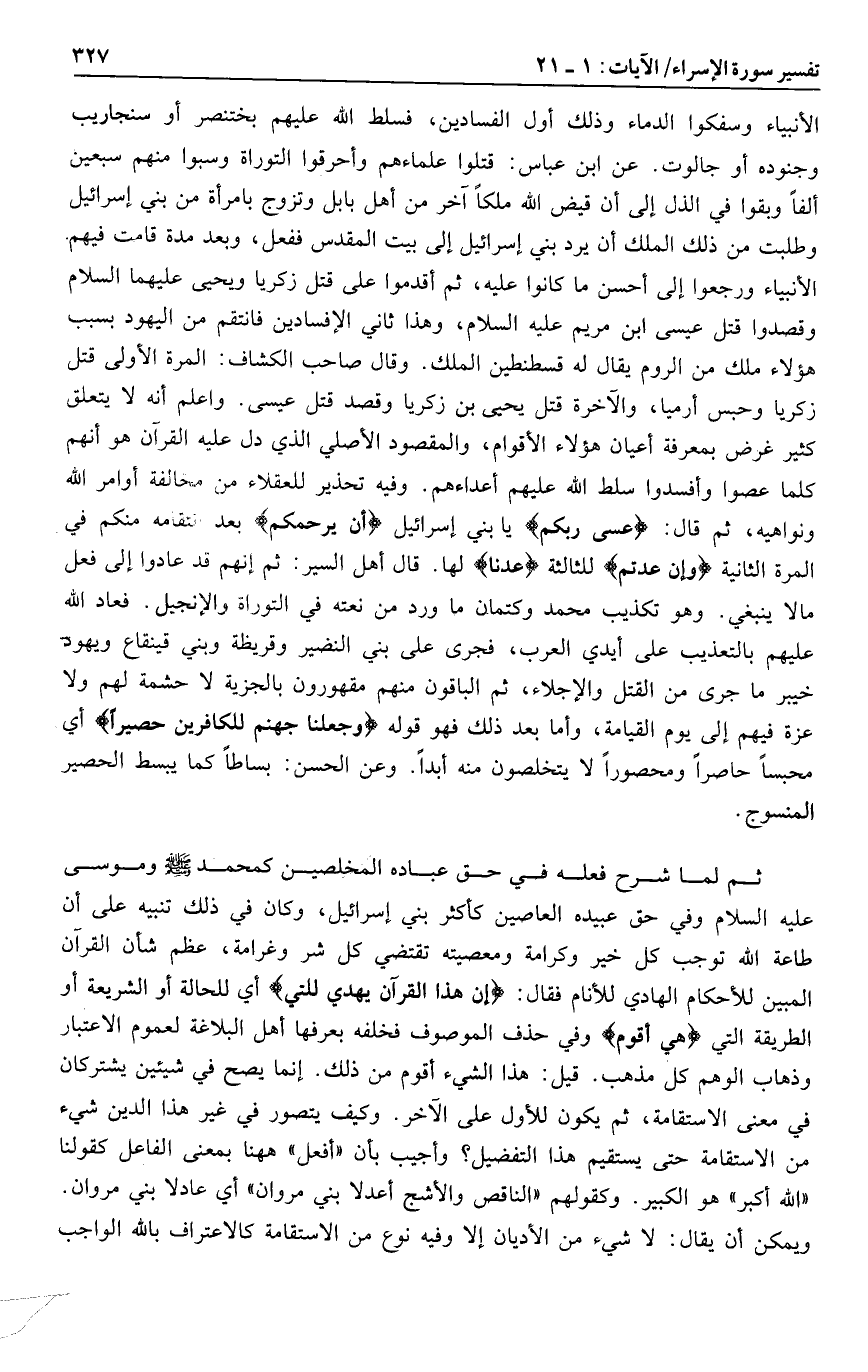ثم لما شرح فعله في حق عباده المخلصين كمحمد صلى الله عليه وسلم وموسى عليه السلام وفي حق عبيده العاصين كأكثر بني إسرائيل، وكان في ذلك تنبيه على أن طاعة الله توجب كل خير وكرامة ومعصيته تقتضي كل شر وغرامة، عظم شأن القرآن المبين للأحكام الهادي للأنام فقال: إِنَّ هذَا الْقُرْآنَ يَهْدِي لِلَّتِي أي للحالة أو الشريعة أو الطريقة التي هِيَ أَقْوَمُ وفي حذف الموصوف فخلفه بعرفها أهل البلاغة لعموم الاعتبار وذهاب الوهم كل مذهب. قيل: هذا الشيء أقوم من ذلك. إنما يصح في شيئين يشتركان في معنى الاستقامة، ثم يكون للأول على الآخر. وكيف يتصور في غير هذا الدين شيء من الاستقامة حتى يستقيم هذا التفضيل؟ وأجيب بأن «أفعل» هاهنا بمعنى الفاعل كقولنا «الله أكبر» هو الكبير. وكقولهم «الناقص والأشج أعدلا بني مروان» أي عادلا بني مروان.