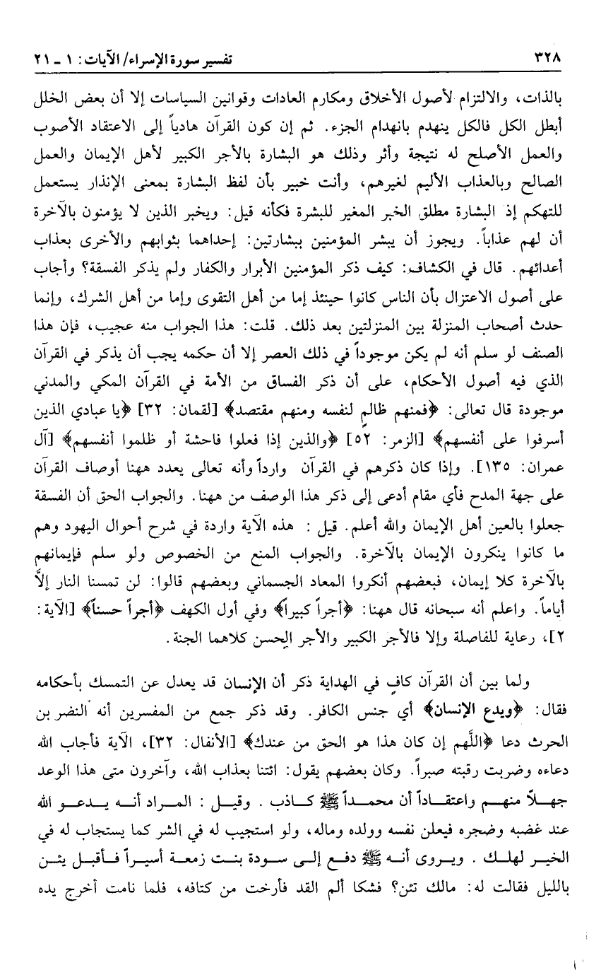 بالذات، والالتزام لأصول الأخلاق ومكارم العادات وقوانين السياسات إلا أن بعض الخلل أبطل الكل فالكل ينهدم بانهدام الجزء. ثم إن كون القرآن هاديا إلى الاعتقاد الأصوب والعمل الأصلح له نتيجة وأثر وذلك هو البشارة بالأجر الكبير لأهل الإيمان والعمل الصالح وبالعذاب الأليم لغيرهم، وأنت خبير بأن لفظ البشارة بمعنى الإنذار يستعمل للتهكم إذ البشارة مطلق الخبر المغير للبشرة فكأنه قيل: ويخبر الذين لا يؤمنون بالآخرة أن لهم عذابا. ويجوز أن يبشر المؤمنين ببشارتين: إحداهما بثوابهم والأخرى بعذاب أعدائهم. قال في الكشاف: كيف ذكر المؤمنين الأبرار والكفار ولم يذكر الفسقة؟ وأجاب على أصول الاعتزال بأن الناس كانوا حينئذ إما من أهل التقوى وإما من أهل الشرك، وإنما حدث أصحاب المنزلة بين المنزلتين بعد ذلك. قلت: هذا الجواب منه عجيب، فإن هذا الصنف لو سلم أنه لم يكن موجودا في ذلك العصر إلا أن حكمه يجب أن يذكر في القرآن الذي فيه أصول الأحكام، على أن ذكر الفساق من الأمة في القرآن المكي والمدني موجودة قال تعالى: فَمِنْهُمْ ظالِمٌ لِنَفْسِهِ وَمِنْهُمْ مُقْتَصِدٌ [لقمان: 32] يا عِبادِيَ الَّذِينَ أَسْرَفُوا عَلى أَنْفُسِهِمْ [الزمر: 52] وَالَّذِينَ إِذا فَعَلُوا فاحِشَةً أَوْ ظَلَمُوا أَنْفُسَهُمْ [آل عمران: 135] . وإذا كان ذكرهم في القرآن واردا وأنه تعالى يعدد هاهنا أوصاف القرآن على جهة المدح فأي مقام أدعى إلى ذكر هذا الوصف من هاهنا. والجواب الحق أن الفسقة جعلوا بالعين أهل الإيمان والله أعلم. قيل: هذه الآية واردة في شرح أحوال اليهود وهم ما كانوا ينكرون الإيمان بالآخرة. والجواب المنع من الخصوص ولو سلم فإيمانهم بالآخرة كلا إيمان، فبعضهم أنكروا المعاد الجسماني وبعضهم قالوا: لن تمسنا النار إلّا أياما. واعلم أنه سبحانه قال هاهنا: أَجْراً كَبِيراً وفي أول الكهف أَجْراً حَسَناً [الآية: