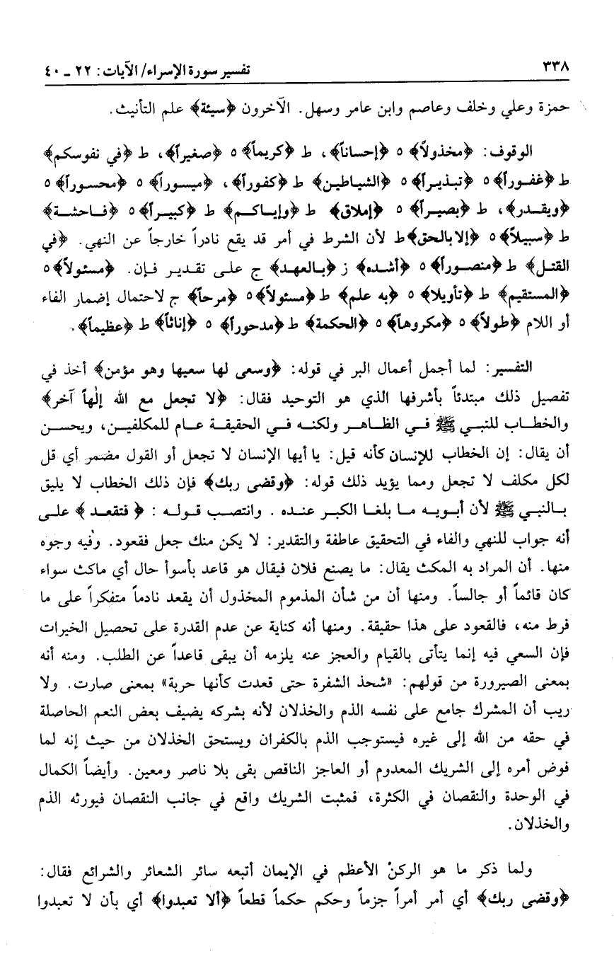 مَخْذُولًا هـ إِحْساناً، ط كَرِيماً هـ صَغِيراً، ط فِي نُفُوسِكُمْ ط غَفُوراً هـ تَبْذِيراً هـ الشَّياطِينِ ط كَفُوراً، مَيْسُوراً هـ مَحْسُوراً هـ وَيَقْدِرُ، ط بَصِيراً هـ إِمْلاقٍ ط وَإِيَّاكُمْ ط كَبِيراً هـ فاحِشَةً ط سَبِيلًا هـ إِلَّا بِالْحَقِّ ط لأن الشرط في أمر قد يقع نادرا خارجا عن النهي. فِي الْقَتْلِ ط مَنْصُوراً هـ أَشُدَّهُ ز بِالْعَهْدِ ج على تقدير فإن. مَسْؤُلًا هـ الْمُسْتَقِيمِ ط تَأْوِيلًا هـ بِهِ عِلْمٌ ط مَسْؤُلًا هـ مَرَحاً ج لاحتمال إضمار الفاء أو اللام طُولًا هـ مَكْرُوهاً هـ الْحِكْمَةِ ط مَدْحُوراً هـ إِناثاً ط عَظِيماً.