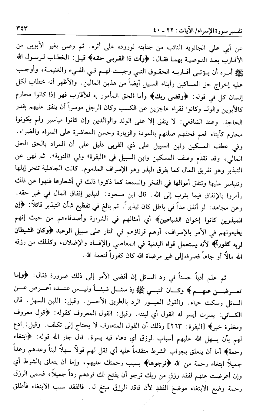 عن أبي علي الجانويه النائب من جنايته لوروده على أثره. ثم وصى بغير الأبوين من الأقارب بعد التوصية بهما فقال: وَآتِ ذَا الْقُرْبى حَقَّهُ قيل: الخطاب لرسول الله صلى الله عليه وسلم أمره أن يؤتى أقاربه الحقوق التي وجبت لهم في الفيء والغنيمة، وأوجب عليه إخراج حق المساكين وأبناء السبيل أيضا من هذين المالين. والأظهر أنه خطاب لكل إنسان كل في قوله: وَقَضى رَبُّكَ وأما الحق المأمور به للأقارب فهو إذا كانوا محارم كالأبوين والولد وكانوا فقراء عاجزين عن الكسب وكان الرجل موسرا أن ينفق عليهم بقدر الحاجة. وعند الشافعي: لا ينفق إلا على الولد والوالدين وإن كانوا مياسير ولم يكونوا محارم كأبناء العم فحقهم صلتهم بالمودة والزيارة وحسن المعاشرة على السراء والضراء.