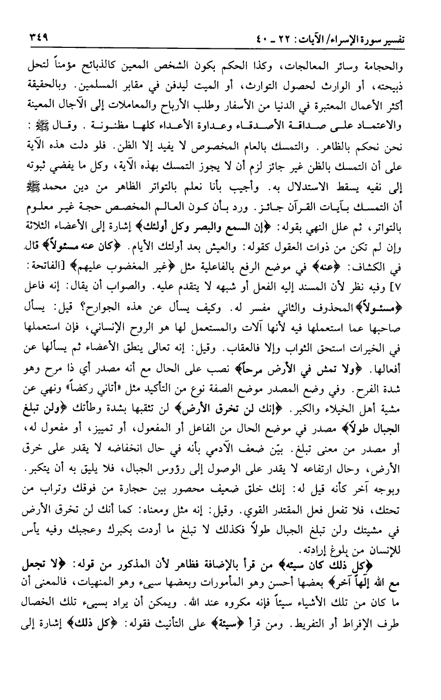 7] وفيه نظر لأن المسند إليه الفعل أو شبهه لا يتقدم عليه. والصواب أن يقال: إنه فاعل مَسْؤُلًا المحذوف والثاني مفسر له. وكيف يسأل عن هذه الجوارح؟ قيل: يسأل صاحبها عما استعملها فيه لأنها آلات والمستعمل لها هو الروح الإنساني، فإن استعملها في الخيرات استحق الثواب وإلا فالعقاب. وقيل: إنه تعالى ينطق الأعضاء ثم يسألها عن أفعالها. وَلا تَمْشِ فِي الْأَرْضِ مَرَحاً نصب على الحال مع أنه مصدر أي ذا مرح وهو شدة الفرح. وفي وضع المصدر موضع الصفة نوع من التأكيد مثل «أتاني ركضا» ونهي عن مشية أهل الخيلاء والكبر. إِنَّكَ لَنْ تَخْرِقَ الْأَرْضَ لن تثقبها بشدة وطأتك وَلَنْ تَبْلُغَ الْجِبالَ طُولًا مصدر في موضع الحال من الفاعل أو المفعول، أو تمييز، أو مفعول له، أو مصدر من معنى تبلغ. بيّن ضعف الآدمي بأنه في حال انخفاضه لا يقدر على خرق الأرض، وحال ارتفاعه لا يقدر على الوصول إلى رؤوس الجبال، فلا يليق به أن يتكبر.