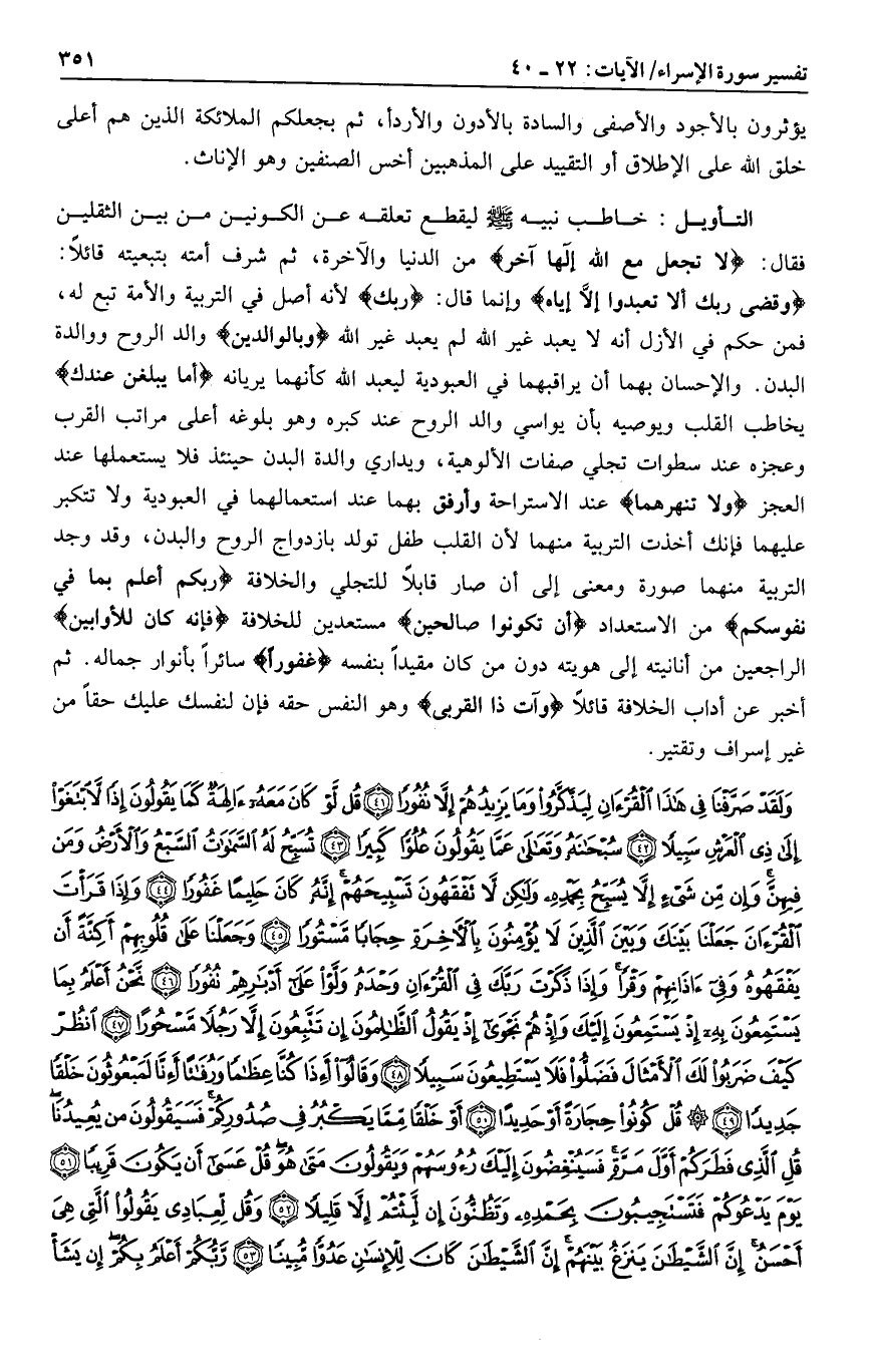 وَقَضى رَبُّكَ أَلَّا تَعْبُدُوا إِلَّا إِيَّاهُ وإنما قال: رَبُّكَ لأنه أصل في التربية والأمة تبع له، فمن حكم في الأزل أنه لا يعبد غير الله لم يعبد غير الله وَبِالْوالِدَيْنِ والد الروح ووالدة البدن. والإحسان بهما أن يراقبهما في العبودية ليعبد الله كأنهما يريانه إِمَّا يَبْلُغَنَّ عِنْدَكَ يخاطب القلب ويوصيه بأن يواسي والد الروح عند كبره وهو بلوغه أعلى مراتب القرب وعجزه عند سطوات تجلي صفات الألوهية، ويداري والدة البدن حينئذ فلا يستعملها عند العجز وَلا تَنْهَرْهُما عند الاستراحة وأرفق بهما عند استعمالهما في العبودية ولا تتكبر عليهما فإنك أخذت التربية منهما لأن القلب طفل تولد بازدواج الروح والبدن، وقد وجد التربية منهما صورة ومعنى إلى أن صار قابلا للتجلي والخلافة رَبُّكُمْ أَعْلَمُ بِما فِي نُفُوسِكُمْ من الاستعداد إِنْ تَكُونُوا صالِحِينَ مستعدين للخلافة فَإِنَّهُ كانَ لِلْأَوَّابِينَ الراجعين من أنانيته إلى هويته دون من كان مقيدا بنفسه غَفُوراً سائرا بأنوار جماله. ثم أخبر عن آداب الخلافة قائلا وَآتِ ذَا الْقُرْبى وهو النفس حقه فإن لنفسك عليك حقا من غير إسراف وتقتير.