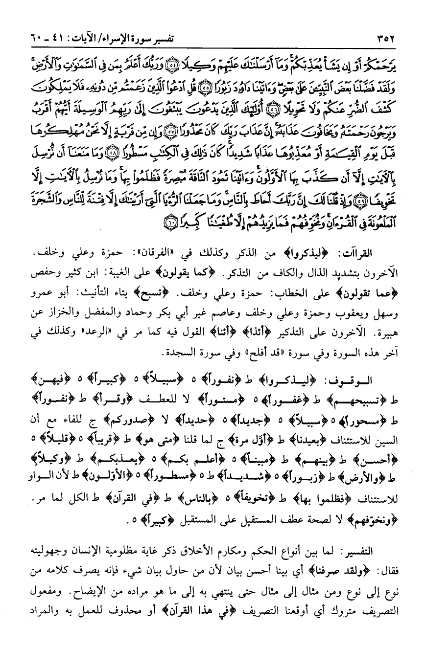 لِيَذَّكَّرُوا ط نُفُوراً هـ سَبِيلًا هـ كَبِيراً هـ فِيهِنَّ ط تَسْبِيحَهُمْ ط غَفُوراً هـ مَسْتُوراً لا للعطف وَقْراً ط نُفُوراً ط مَسْحُوراً هـ سَبِيلًا هـ جَدِيداً هـ حَدِيداً لا صُدُورِكُمْ ج للفاء مع أن السين للاستئناف يُعِيدُنا ط أَوَّلَ مَرَّةٍ ج لما قلنا مَتى هُوَ ط قَرِيباً هـ قَلِيلًا هـ أَحْسَنُ ط بَيْنَهُمْ ط مُبِيناً هـ أَعْلَمُ بِكُمْ هـ يُعَذِّبْكُمْ ط وَكِيلًا ط وَالْأَرْضِ ط زَبُوراً هـ شَدِيداً ط هـ مَسْطُوراً هـ الْأَوَّلُونَ ط لأن الواو للاستئناف فَظَلَمُوا بِها ط تَخْوِيفاً هـ بِالنَّاسِ ط فِي الْقُرْآنِ ط الكل لما مر.