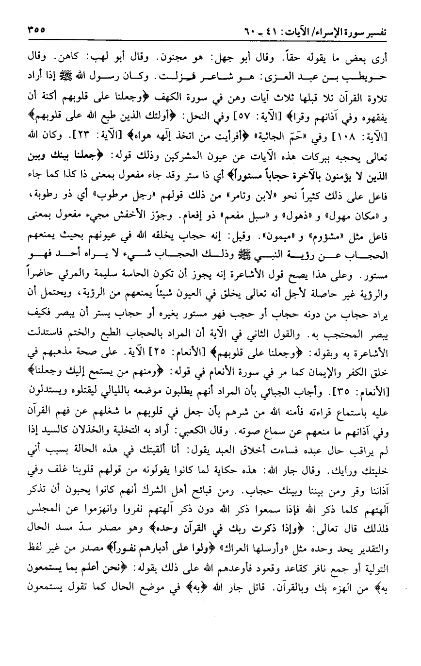 وكان الله تعالى يحجبه ببركات هذه الآيات عن عيون المشركين وذلك قوله: جَعَلْنا بَيْنَكَ وَبَيْنَ الَّذِينَ لا يُؤْمِنُونَ بِالْآخِرَةِ حِجاباً مَسْتُوراً أي ذا ستر وقد جاء مفعول بمعنى ذا كذا كما جاء فاعل على ذلك كثيرا نحو «لابن وتامر» من ذلك قولهم «رجل مرطوب» أي ذو رطوبة، و «مكان مهول» و «ذهول» و «سبل مفعم» ذو إفعام. وجوّز الأخفش مجيء مفعول بمعنى فاعل مثل «مشؤوم» و «ميمون» . وقيل: إنه حجاب يخلقه الله في عيونهم بحيث يمنعهم الحجاب عن رؤية النبي صلى الله عليه وسلم وذلك الحجاب شيء لا يراه أحد فهو مستور. وعلى هذا يصح قول الأشاعرة إنه يجوز أن تكون الحاسة سليمة والمرئي حاضرا والرؤية غير حاصلة لأجل أنه تعالى يخلق في العيون شيئا يمنعهم من الرؤية، ويحتمل أن يراد حجاب من دونه حجاب أو حجب فهو مستور بغيره أو حجاب يستر أن يبصر فكيف يبصر المحتجب به. والقول الثاني في الآية أن المراد بالحجاب الطبع والختم فاستدلت الأشاعرة به وبقوله: وَجَعَلْنا عَلى قُلُوبِهِمْ [الأنعام: 25] الآية. على صحة مذهبهم في خلق الكفر والإيمان كما مر في سورة الأنعام في قوله: وَمِنْهُمْ مَنْ يَسْتَمِعُ إِلَيْكَ وَجَعَلْنا [الأنعام: 35] . وأجاب الجبائي بأن المراد أنهم يطلبون موضعه بالليالي ليقتلوه ويستدلون عليه باستماع قراءته فأمنه الله من شرهم بأن جعل في قلوبهم ما شغلهم عن فهم القرآن وفي آذانهم ما منعهم عن سماع صوته. وقال الكعبي: أراد به التخلية والخذلان كالسيد إذا لم يراقب حال عبده فساءت أخلاق العبد يقول: أنا ألقيتك في هذه الحالة بسبب أني لم يراقب حال عبده فساءت أخلاق العبد يقول: أنا ألقيتك في هذه الحالة بسبب أني خليتك ورأيك. وقال جار الله: هذه حكاية لما كانوا يقولونه من قولهم قلوبنا غلف وفي آذاننا وقر ومن بيننا وبينك حجاب. ومن قبائح أهل الشرك أنهم كانوا يحبون أن تذكر آلهتهم كلما ذكر الله فإذا سمعوا ذكر الله دون ذكر آلهتهم نفروا وانهزموا عن المجلس فلذلك قال تعالى: وَإِذا ذَكَرْتَ رَبَّكَ فِي الْقُرْآنِ وَحْدَهُ وهو مصدر سدّ مسد الحال والتقدير يحد وحده مثل «وأرسلها العراك» وَلَّوْا عَلى أَدْبارِهِمْ نُفُوراً مصدر من غير لفظ التولية أو جمع نافر كقاعد وقعود فأوعدهم الله على ذلك بقوله: نَحْنُ أَعْلَمُ بِما يَسْتَمِعُونَ بِهِ من الهزء بك وبالقرآن. قاتل جار الله بِهِ في موضع الحال كما تقول يستمعون