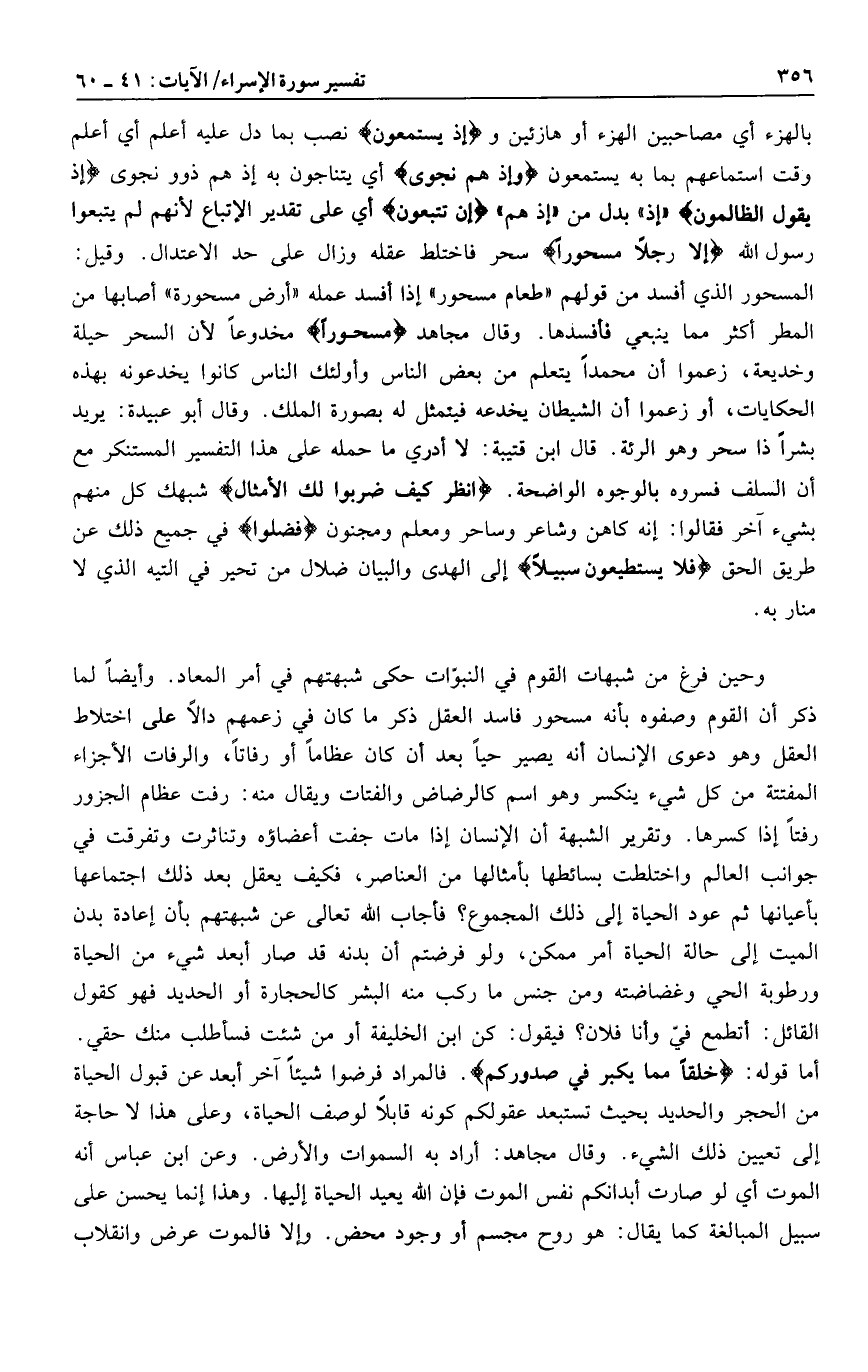 وحين فرغ من شبهات القوم في النبوّات حكى شبهتهم في أمر المعاد. وأيضا لما ذكر أن القوم وصفوه بأنه مسحور فاسد العقل ذكر ما كان في زعمهم دالا على اختلاط العقل وهو دعوى الإنسان أنه يصير حيا بعد أن كان عظاما أو رفاتا، والرفات الأجزاء المفتتة من كل شيء ينكسر وهو اسم كالرضاض والفتات ويقال منه: رفت عظام الجزور رفتا إذا كسرها. وتقرير الشبهة أن الإنسان إذا مات جفت أعضاؤه وتناثرت وتفرقت في جوانب العالم واختلطت بسائطها بأمثالها من العناصر، فكيف يعقل بعد ذلك اجتماعها بأعيانها ثم عود الحياة إلى ذلك المجموع؟ فأجاب الله تعالى عن شبهتهم بأن إعادة بدن الميت إلى حالة الحياة أمر ممكن، ولو فرضتم أن بدنه قد صار أبعد شيء من الحياة ورطوبة الحي وغضاضته ومن جنس ما ركب منه البشر كالحجارة أو الحديد فهو كقول القائل: أتطمع فيّ وأنا فلان؟ فيقول: كن ابن الخليفة أو من شئت فسأطلب منك حقي.