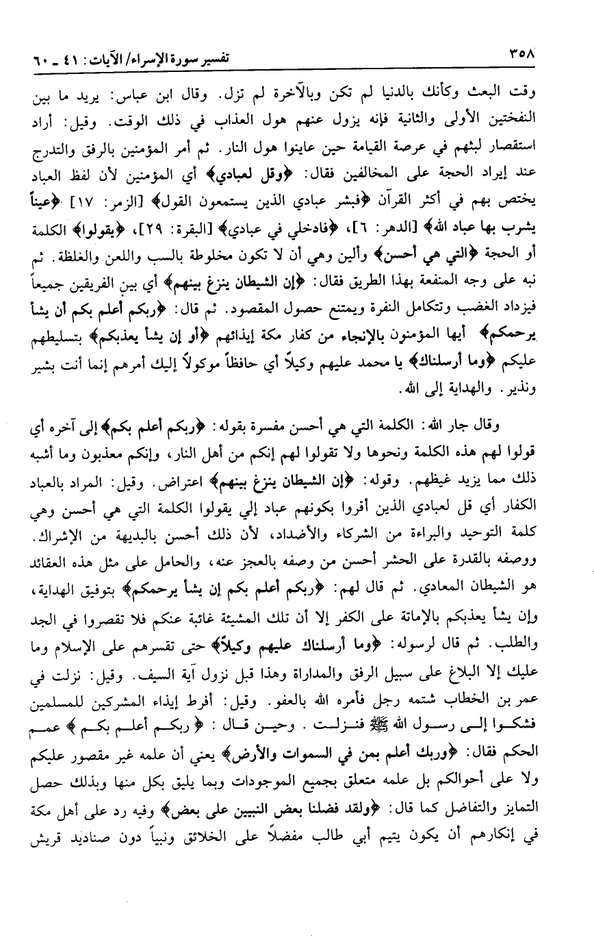 وقال جار الله: الكلمة التي هي أحسن مفسرة بقوله: رَبُّكُمْ أَعْلَمُ بِكُمْ إلى آخره أي قولوا لهم هذه الكلمة ونحوها ولا تقولوا لهم إنكم من أهل النار، وإنكم معذبون وما أشبه ذلك مما يزيد غيظهم. وقوله: إِنَّ الشَّيْطانَ يَنْزَغُ بَيْنَهُمْ اعتراض. وقيل: المراد بالعباد الكفار أي قل لعبادي الذين أقروا بكونهم عباد إلي يقولوا الكلمة التي هي أحسن وهي كلمة التوحيد والبراءة من الشركاء والأضداد، لأن ذلك أحسن بالبديهة من الإشراك.