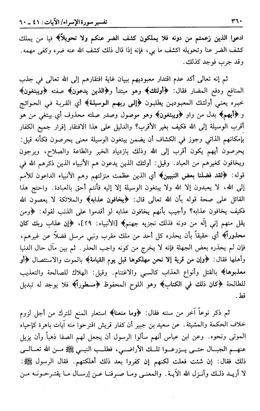 يحرصون أيهم يكون أقرب إلى الله وذلك بازدياد الخير والطاعة والصلاح، ويرجون ويخافون كغيرهم من العباد. وقيل: أولئك الذين يدعون هم الأنبياء الذين ذكرهم الله في قوله: لَقَدْ فَضَّلْنا بَعْضَ النَّبِيِّينَ أي الذين عظمت منزلتهم وهم الأنبياء الداعون للأمم إلى الله، لا يعبدون إلا الله ولا يبتغون الوسيلة إلا إليه فأنتم أحق بالعبادة. واحتج هذا القائل على صحة قوله بأن الله تعالى قال: يَخافُونَ عَذابَهُ والملائكة لا يعصون الله فكيف يخافون عذابه؟ وأجيب بأنهم يخافون عذابه لو أقدموا على الذنب لقوله: وَمَنْ يَقُلْ مِنْهُمْ إِنِّي إِلهٌ مِنْ دُونِهِ فَذلِكَ نَجْزِيهِ جَهَنَّمَ [الأنبياء: 29] ، إِنَّ عَذابَ رَبِّكَ كانَ مَحْذُوراً أي حقيقا بأن يحذره كل أحد من ملك مقرب ونبي مرسل فضلا عن غيرهم، فإن لم يحذره بعض الجهلة فإنه لا يخرج من كونه واجب الحذر. ثم بين مآل حال الدنيا وأهلها فقال: وَإِنْ مِنْ قَرْيَةٍ إِلَّا نَحْنُ مُهْلِكُوها قَبْلَ يَوْمِ الْقِيامَةِ بالموت والاستئصال أَوْ مُعَذِّبُوها بالقتل وأنواع العذاب كالسبي والاغتنام. وقيل: الهلاك للصالحة والتعذيب للطالحة كانَ ذلِكَ فِي الْكِتابِ وهو اللوح المخفوظ مَسْطُوراً فلا يوجد له تبديل قط.