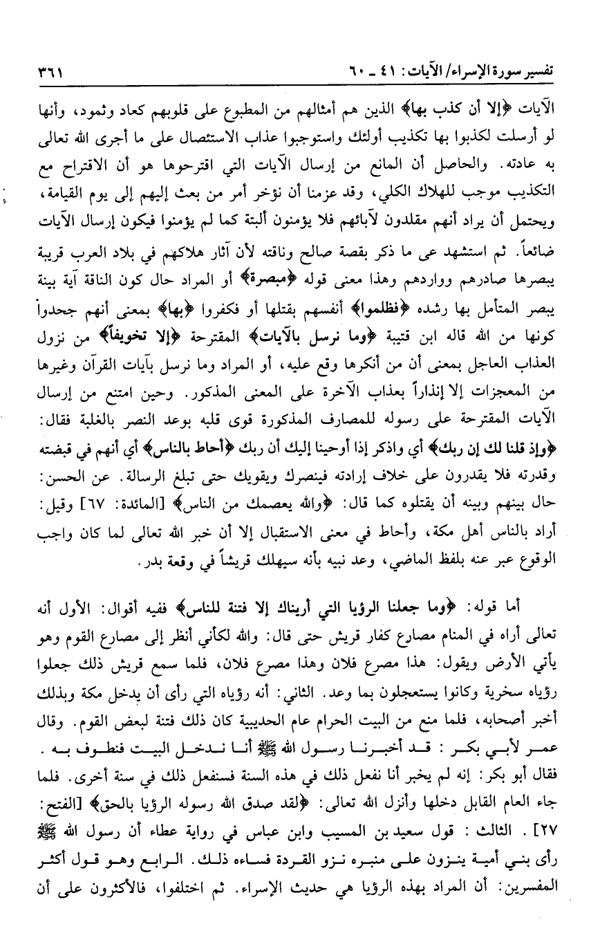 أما قوله: وَما جَعَلْنَا الرُّؤْيَا الَّتِي أَرَيْناكَ إِلَّا فِتْنَةً لِلنَّاسِ ففيه أقوال: الأول أنه تعالى أراه في المنام مصارع كفار قريش حتى قال: والله لكأني أنظر إلى مصارع القوم وهو يأتي الأرض ويقول: هذا مصرع فلان وهذا مصرع فلان، فلما سمع قريش ذلك جعلوا رؤياه سخرية وكانوا يستعجلون بما وعد. الثاني: أنه رؤياه التي رأى أن يدخل مكة وبذلك أخبر أصحابه، فلما منع من البيت الحرام عام الحديبية كان ذلك فتنة لبعض القوم. وقال عمر لأبي بكر: قد أخبرنا رسول الله صلى الله عليه وسلم أنا ندخل البيت فنطوف به.