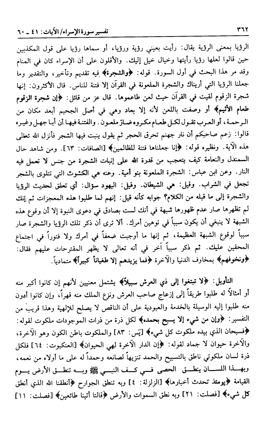 الرؤيا بمعنى الرؤية يقال: رأيت بعيني رؤية ورؤيا، أو سماها رؤيا على قول المكذبين حين قالوا لعلها رؤيا رأيتها وخيال خيل إليك. والأقلون على أن الإسراء كان في المنام وقد مر هذا البحث في أول السورة. قوله: وَالشَّجَرَةَ فيه تقديم وتأخير، والتقدير وما جعلنا الرؤيا التي أريناك والشجرة الملعونة في القرآن إلا فتنة للناس. قال الأكثرون: إنها شجرة الزقوم لقيت في القرآن حيث لعن طاعموها. قال عز من قائل: إِنَّ شَجَرَةَ الزَّقُّومِ طَعامُ الْأَثِيمِ أو وصفت باللعن لأنه إلا بعاد وهي في أصل الجحيم أبعد مكان من الرحمة، أو العرب تقول لكل طعام مكروه ضارّ ملعون. والفتنة فيها أن أبا جهل وغيره قالوا: زعم صاحبكم أن نار جهنم تحرق الحجر ثم يقول ينبت فيها الشجر فأنزل الله تعالى هذه الآية. ونظيره قوله: إِنَّا جَعَلْناها فِتْنَةً لِلظَّالِمِينَ [الصافات: 63] . ومن شاهد حال السمندل والنعامة كيف يتعجب من قدرة الله على إنبات الشجرة من جنس لا تعمل فيه النار. وعن ابن عباس: الشجرة الملعونة بنو أمية. وعنه هي الكشوث التي تتلوى بالشجر تجعل في الشراب. وقيل: هي الشيطان. وقيل: اليهود سؤال: أي تعلق لحديث الرؤيا والشجرة إلى ما قبله من الكلام؟ جوابه كأنه قيل: إنهم لما طلبوا هذه المعجزات ثم إنك لم تظهرها صار عدم ظهورها شبهة في أنك لست بصادق في دعوى النبوة إلا أن وقوع هذه الشبهة لا ينبغي أن يكون سببا في توهين أمرك. ألا ترى أن ذكر تلك الرؤيا والشجرة صار سببا لوقوع الشبهة العظيمة، ثم إنها ما أوجبت ضعفا في أمرك ولا فتورا في اجتماع المحقين عليك. ثم ذكر سببا آخر في أنه تعالى لا يظهر المقترحات عليهم فقال: