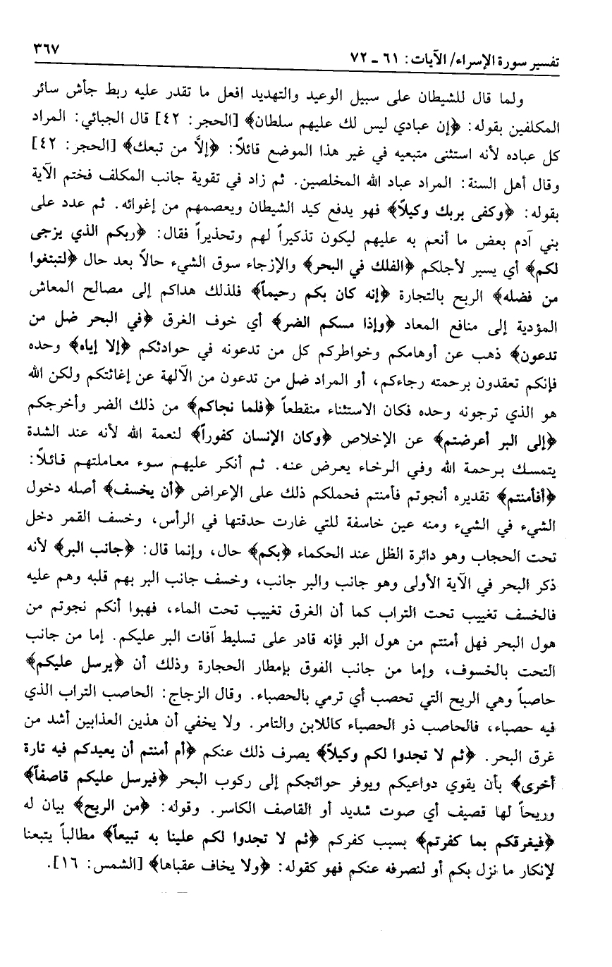 ولما قال للشيطان على سبيل الوعيد والتهديد افعل ما تقدر عليه ربط جأش سائر المكلفين بقوله: إِنَّ عِبادِي لَيْسَ لَكَ عَلَيْهِمْ سُلْطانٌ [الحجر: 42] قال الجبائي: المراد كل عباده لأنه استثنى متبعيه في غير هذا الموضع قائلا: إلّا من تبعك [الحجر: 42] وقال أهل السنة: المراد عباد الله المخلصين. ثم زاد في تقوية جانب المكلف فختم الآية بقوله: وَكَفى بِرَبِّكَ وَكِيلًا فهو يدفع كيد الشيطان ويعصمهم من إغوائه. ثم عدد على بني آدم بعض ما أنعم به عليهم ليكون تذكيرا لهم وتحذيرا فقال: رَبُّكُمُ الَّذِي يُزْجِي لَكُمُ أي يسير لأجلكم الْفُلْكَ فِي الْبَحْرِ والإزجاء سوق الشيء حالا بعد حال لِتَبْتَغُوا مِنْ فَضْلِهِ الربح بالتجارة إِنَّهُ كانَ بِكُمْ رَحِيماً فلذلك هداكم إلى مصالح المعاش المؤدية إلى منافع المعاد وَإِذا مَسَّكُمُ الضُّرُّ أي خوف الغرق فِي الْبَحْرِ ضَلَّ مَنْ تَدْعُونَ ذهب عن أوهامكم وخواطركم كل من تدعونه في حوادثكم إِلَّا إِيَّاهُ وحده فإنكم تعقدون برحمته رجاءكم، أو المراد ضل من تدعون من الآلهة عن إغاثتكم ولكن الله هو الذي ترجونه وحده فكان الاستثناء منقطعا فَلَمَّا نَجَّاكُمْ من ذلك الضر وأخرجكم إِلَى الْبَرِّ أَعْرَضْتُمْ عن الإخلاص وَكانَ الْإِنْسانُ كَفُوراً لنعمة الله لأنه عند الشدة يتمسك برحمة الله وفي الرخاء يعرض عنه. ثم أنكر عليهم سوء معاملتهم قائلا: