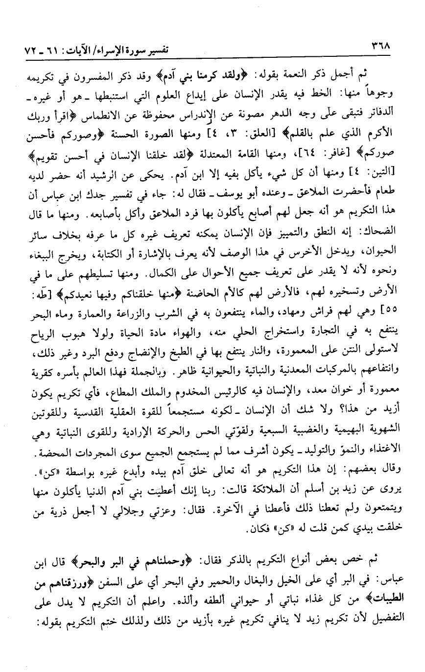 ثم أجمل ذكر النعمة بقوله: وَلَقَدْ كَرَّمْنا بَنِي آدَمَ وقد ذكر المفسرون في تكريمه وجوها منها: الخط فيه يقدر الإنسان على إيداع العلوم التي استنبطها- هو أو غيره- الدفاتر فتبقى على وجه الدهر مصونة عن الاندراس محفوظة عن الانطماس اقْرَأْ وَرَبُّكَ الْأَكْرَمُ الَّذِي عَلَّمَ بِالْقَلَمِ [العلق: 3، 4] ومنها الصورة الحسنة وَصَوَّرَكُمْ فَأَحْسَنَ صُوَرَكُمْ [غافر: 64] ، ومنها القامة المعتدلة لَقَدْ خَلَقْنَا الْإِنْسانَ فِي أَحْسَنِ تَقْوِيمٍ [التين: 4] ومنها أن كل شيء يأكل بقية إلا ابن آدم. يحكى عن الرشيد أنه حضر لديه طعام فأحضرت الملاعق- وعنده أبو يوسف- فقال له: جاء في تفسير جدك ابن عباس أن هذا التكريم هو أنه جعل لهم أصابع يأكلون بها فرد الملاعق وأكل بأصابعه. ومنها ما قال الضحاك: إنه النطق والتمييز فإن الإنسان يمكنه تعريف غيره كل ما عرفه بخلاف سائر الحيوان، ويدخل الأخرس في هذا الوصف لأنه يعرف بالإشارة أو الكتابة، ويخرج الببغاء ونحوه لأنه لا يقدر على تعريف جميع الأحوال على الكمال. ومنها تسليطهم على ما في الأرض وتسخيره لهم، فالأرض لهم كالأم الحاضنة مِنْها خَلَقْناكُمْ وَفِيها نُعِيدُكُمْ [طه: