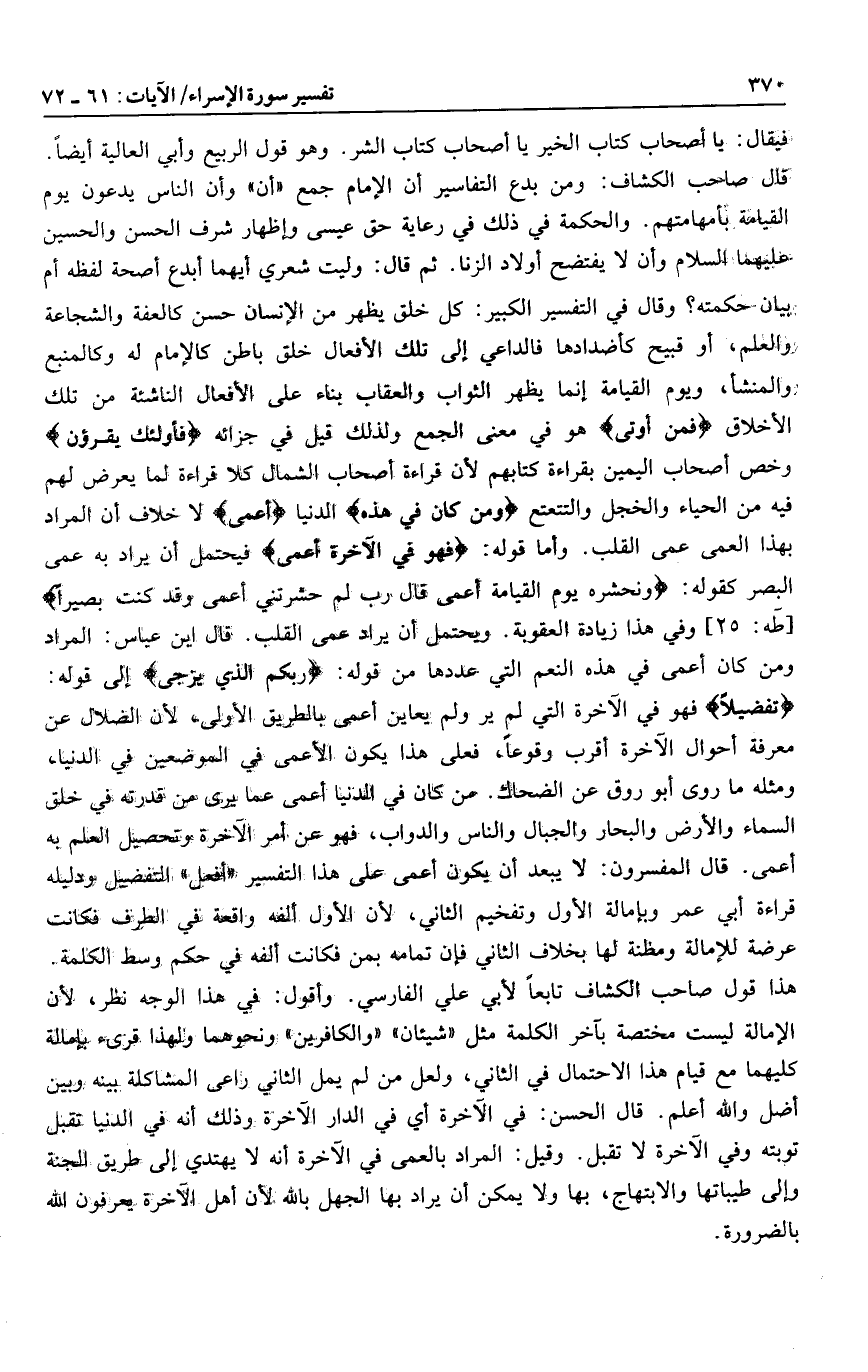 قال صاحب الكشاف: ومن بدع التفاسير أن الإمام جمع «أن» وأن الناس يدعون يوم القيامة بأمهامتهم. والحكمة في ذلك في رعاية حق عيسى وإظهار شرف الحسن والحسين عليهما السلام وأن لا يفتضح أولاد الزنا. ثم قال: وليت شعري أيهما أبدع أصحة لفظه أم بيان حكمته؟ وقال في التفسير الكبير: كل خلق يظهر من الإنسان حسن كالعفة والشجاعة والعلم، أو قبيح كأضدادها فالداعي إلى تلك الأفعال خلق باطن كالإمام له وكالمنبع والمنشأ، ويوم القيامة إنما يظهر الثواب والعقاب بناء على الأفعال الناشئة من تلك الأخلاق فَمَنْ أُوتِيَ هو في معنى الجمع ولذلك قيل في جزائه فَأُولئِكَ يَقْرَؤُنَ وخص أصحاب اليمين بقراءة كتابهم لأن قراءة أصحاب الشمال كلا قراءة لما يعرض لهم فيه من الحياء والخجل والتتعتع وَمَنْ كانَ فِي هذِهِ الدنيا أَعْمى لا خلاف أن المراد بهذا العمى عمى القلب. وأما قوله: فَهُوَ فِي الْآخِرَةِ أَعْمى فيحتمل أن يراد به عمى البصر كقوله: وَنَحْشُرُهُ يَوْمَ الْقِيامَةِ أَعْمى قالَ رَبِّ لِمَ حَشَرْتَنِي أَعْمى وَقَدْ كُنْتُ بَصِيراً [طه: 25] وفي هذا زيادة العقوبة. ويحتمل أن يراد عمى القلب. قال ابن عباس: المراد ومن كان أعمى في هذه النعم التي عددها من قوله: رَبُّكُمُ الَّذِي يُزْجِي إلى قوله: