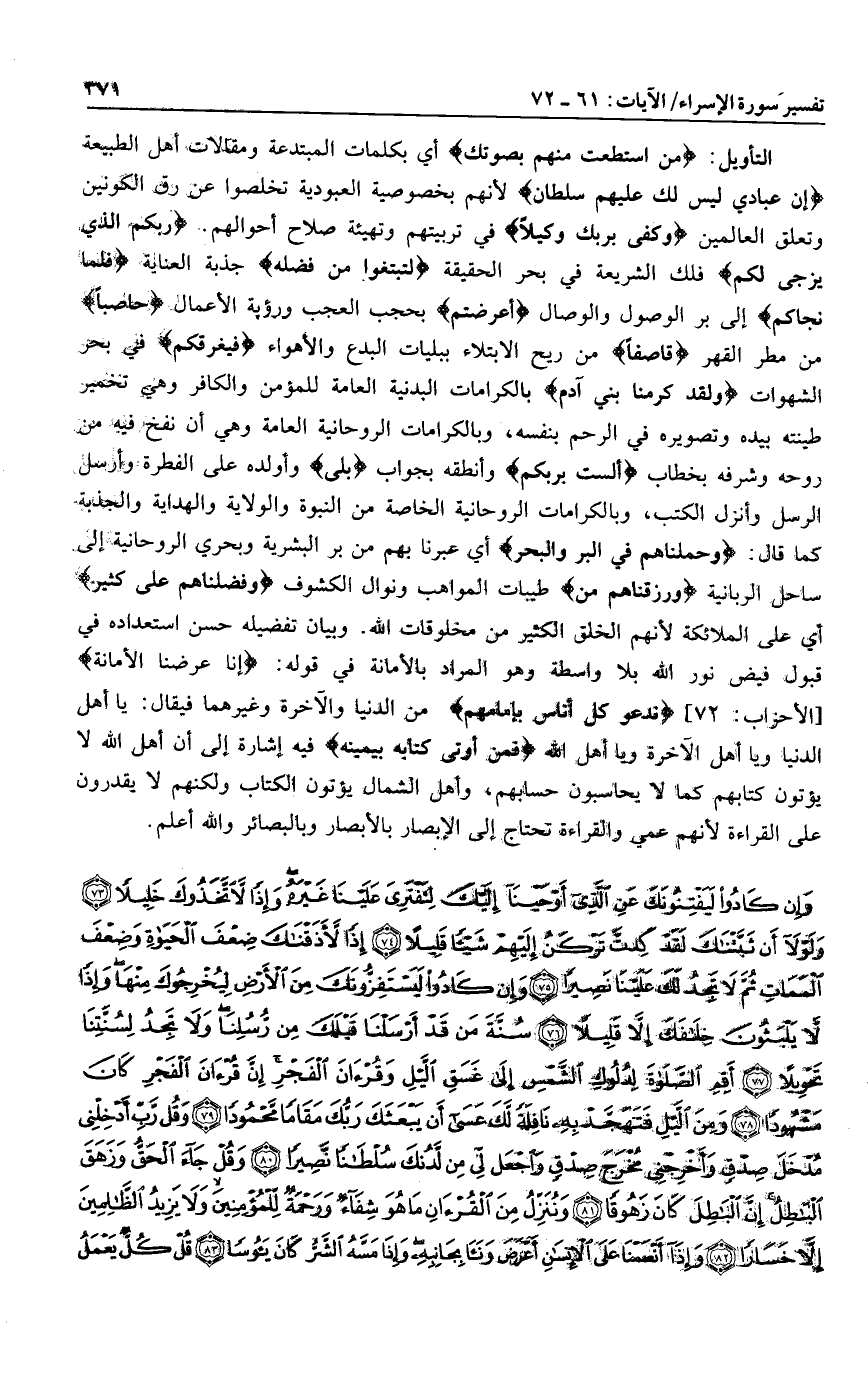 مَنِ اسْتَطَعْتَ مِنْهُمْ بِصَوْتِكَ أي بكلمات المبتدعة ومقالات أهل الطبيعة إِنَّ عِبادِي لَيْسَ لَكَ عَلَيْهِمْ سُلْطانٌ لأنهم بخصوصية العبودية تخلصوا عن رق الكونين وتعلق العالمين وَكَفى بِرَبِّكَ وَكِيلًا في تربيتهم وتهيئة صلاح أحوالهم. رَبُّكُمُ الَّذِي يُزْجِي لَكُمُ فلك الشريعة في بحر الحقيقة لِتَبْتَغُوا مِنْ فَضْلِهِ جذبة العناية فَلَمَّا نَجَّاكُمْ إلى بر الوصول والوصال أَعْرَضْتُمْ بحجب العجب ورؤية الأعمال حاصِباً من مطر القهر قاصِفاً من ريح الابتلاء ببليات البدع والأهواء فَيُغْرِقَكُمْ في بحر الشهوات وَلَقَدْ كَرَّمْنا بَنِي آدَمَ بالكرامات البدنية العامة للمؤمن والكافر وهي تخمير طينته بيده وتصويره في الرحم بنفسه، وبالكرامات الروحانية العامة وهي أن نفخ فيه من روحه وشرفه بخطاب أَلَسْتُ بِرَبِّكُمْ وأنطقه بجواب بَلى وأولده على الفطرة وأرسل الرسل وأنزل الكتب، وبالكرامات الروحانية الخاصة من النبوة والولاية والهداية والجذبة كما قال: وَحَمَلْناهُمْ فِي الْبَرِّ وَالْبَحْرِ أي عبرنا بهم من بر البشرية وبحري الروحانية إلى ساحل الربانية وَرَزَقْناهُمْ مِنَ طيبات المواهب ونوال الكشوف وَفَضَّلْناهُمْ عَلى كَثِيرٍ أي على الملائكة لأنهم الخلق الكثير من مخلوقات الله. وبيان تفضيله حسن استعداده في قبول فيض نور الله بلا واسطة وهو المراد بالأمانة في قوله: إِنَّا عَرَضْنَا الْأَمانَةَ [الأحزاب: 72] نَدْعُوا كُلَّ أُناسٍ بِإِمامِهِمْ من الدنيا والآخرة وغير هما فيقال: يا أهل الدنيا ويا أهل الآخرة ويا أهل الله فَمَنْ أُوتِيَ كِتابَهُ بِيَمِينِهِ فيه إشارة إلى أن أهل الله لا يؤتون كتابهم كما لا يحاسبون حسابهم، وأهل الشمال يؤتون الكتاب ولكنهم لا يقدرون على القراءة لأنهم عمي والقراءة تحتاج إلى الإبصار بالأبصار وبالبصائر والله أعلم.