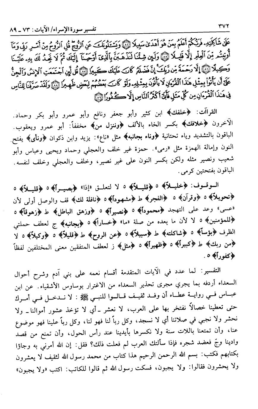 خَلِيلًا هـ قَلِيلًا هـ لا لتعلق «إذا» نَصِيراً هـ قَلِيلًا هـ تَحْوِيلًا هـ وَقُرْآنَ هـ الْفَجْرِ ط مَشْهُوداً هـ نافِلَةً لَكَ قف والوصل أولى لأن «عسى» وعد على التهجد مَحْمُوداً هـ نَصِيراً هـ وَزَهَقَ الْباطِلُ ط زَهُوقاً هـ لِلْمُؤْمِنِينَ هـ لا لأن ما بعده من صلة «ما» خَساراً هـ بِجانِبِهِ ج لعطف حملتي الظرف يَؤُساً هـ شاكِلَتِهِ ط سَبِيلًا هـ عَنِ الرُّوحِ ط قَلِيلًا هـ وَكِيلًا هـ لا مِنْ رَبِّكَ ط كَبِيراً هـ ظَهِيراً هـ مَثَلٍ ز لعطف المتفقين معنى المختلفين لفظا كُفُوراً هـ.