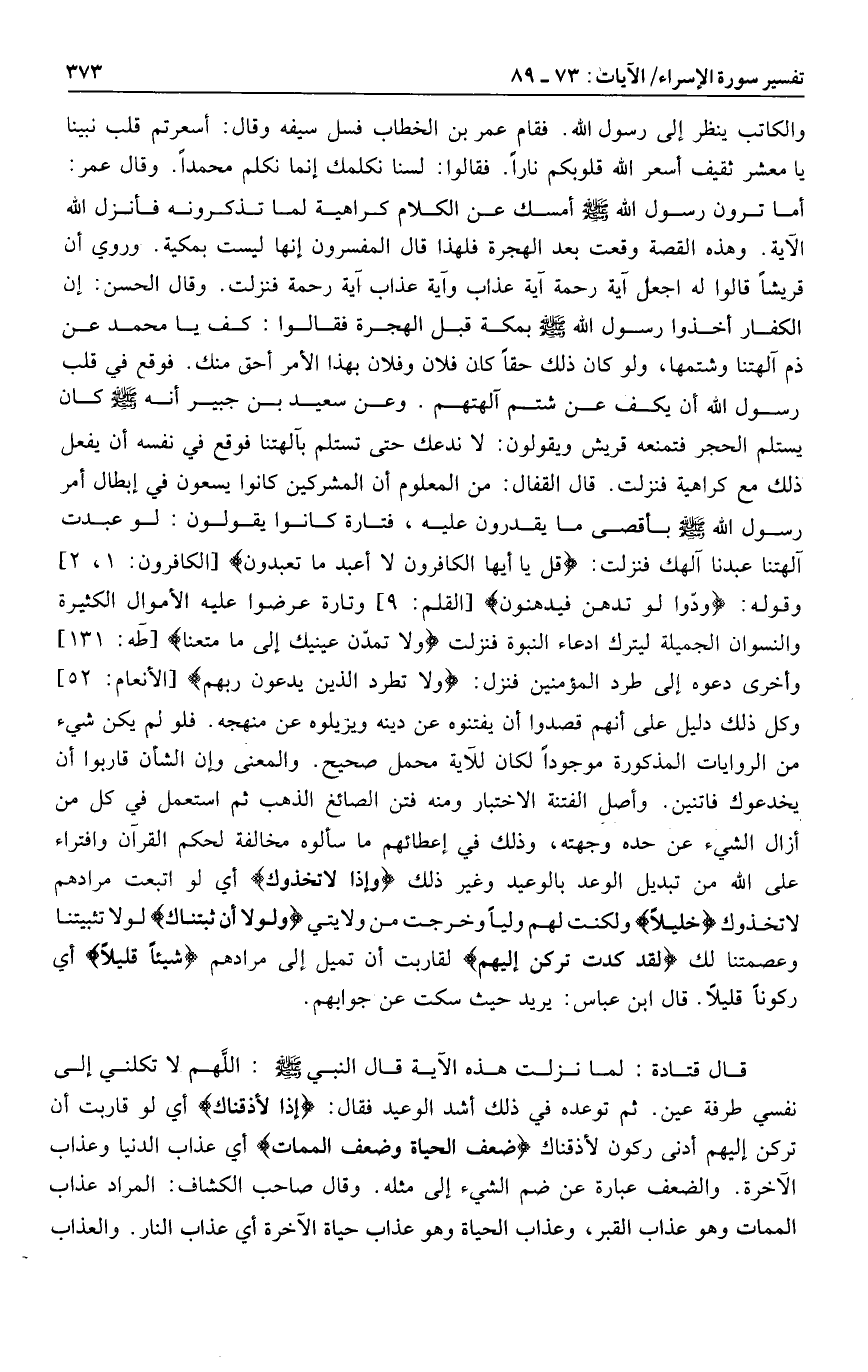 قال القفال: من المعلوم أن المشركين كانوا يسعون في إبطال أمر رسول الله صلى الله عليه وسلم بأقصى ما يقدرون عليه، فتارة كانوا يقولون: لو عبدت آلهتنا عبدنا آلهك فنزلت: قُلْ يا أَيُّهَا الْكافِرُونَ لا أَعْبُدُ ما تَعْبُدُونَ [الكافرون: 1، 2] وقوله: وَدُّوا لَوْ تُدْهِنُ فَيُدْهِنُونَ [القلم: 9] وتارة عرضوا عليه الأموال الكثيرة والنسوان الجميلة ليترك ادعاء النبوة فنزلت وَلا تَمُدَّنَّ عَيْنَيْكَ إِلى ما مَتَّعْنا [طه: 131] وأخرى دعوه إلى طرد المؤمنين فنزل: وَلا تَطْرُدِ الَّذِينَ يَدْعُونَ رَبَّهُمْ [الأنعام: 52] وكل ذلك دليل على أنهم قصدوا أن يفتنوه عن دينه ويزيلوه عن منهجه. فلو لم يكن شيء من الروايات المذكورة موجودا لكان للآية محمل صحيح. والمعنى وإن الشأن قاربوا أن يخدعوك فاتنين. وأصل الفتنة الاختبار ومنه فتن الصائغ الذهب ثم استعمل في كل من أزال الشيء عن حده وجهته، وذلك في إعطائهم ما سألوه مخالفة لحكم القرآن وافتراء على الله من تبديل الوعد بالوعيد وغير ذلك وَإِذاً لَاتَّخَذُوكَ أي لو اتبعت مرادهم لا تخذوك خَلِيلًا ولكنت لهم وليا وخرجت من ولايتي وَلَوْلا أَنْ ثَبَّتْناكَ لولا تثبيتنا وعصمتنا لك لَقَدْ كِدْتَ تَرْكَنُ إِلَيْهِمْ لقاربت أن تميل إلى مرادهم شَيْئاً قَلِيلًا أي ركونا قليلا. قال ابن عباس: يريد حيث سكت عن جوابهم.