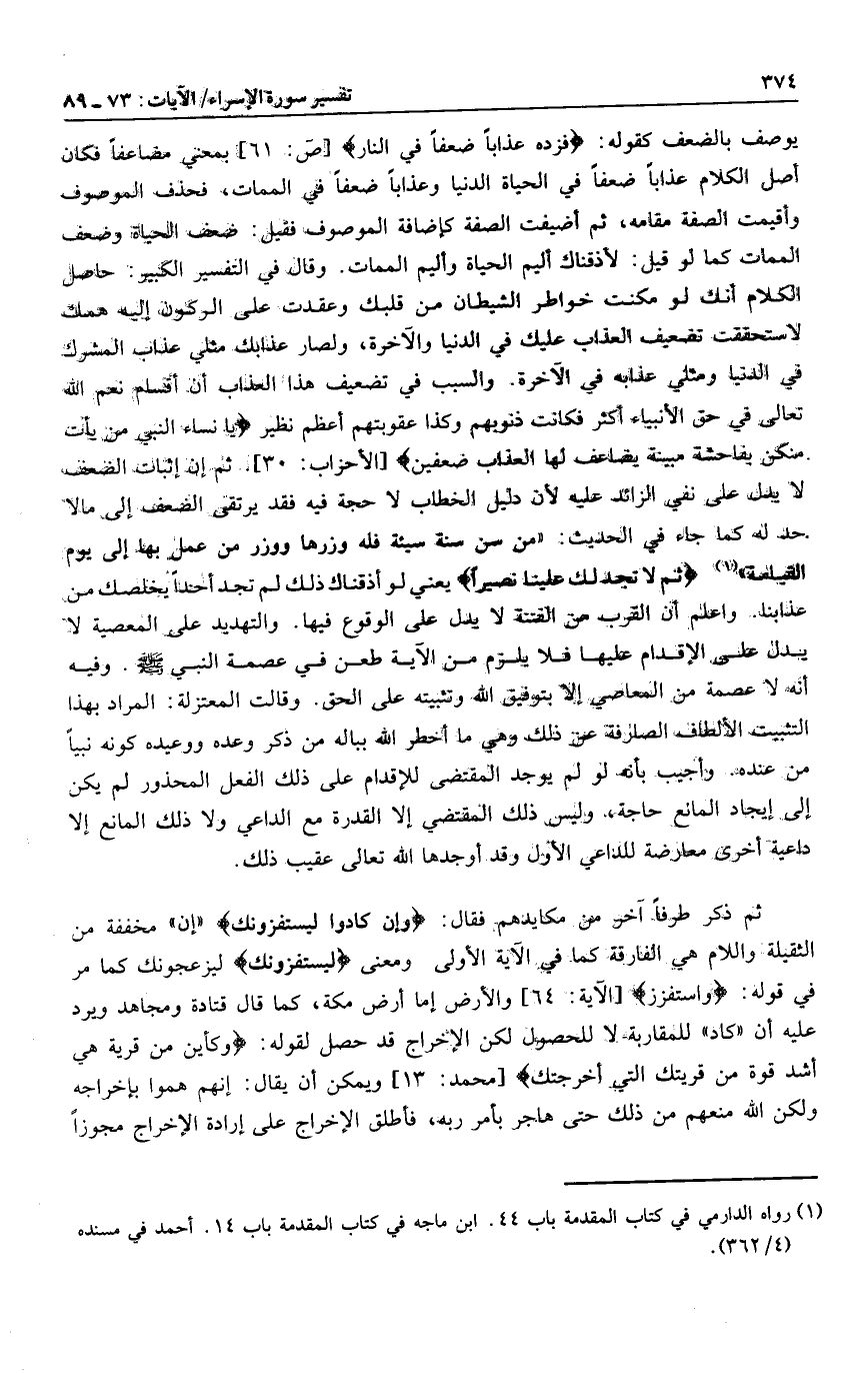 ثُمَّ لا تَجِدُ لَكَ عَلَيْنا نَصِيراً يعني لو أذقناك ذلك لم تجد أحدا يخلصك من عذابنا. واعلم أن القرب من الفتنة لا يدل على الوقوع فيها. والتهديد على المعصية لا يدل على الإقدام عليها فلا يلزم من الآية طعن في عصمة النبي صلى الله عليه وسلم. وفيه أنه لا عصمة من المعاصي إلا بتوفيق الله وتثبيته على الحق. وقالت المعتزلة: المراد بهذا التثبيت الألطاف الصارفة عن ذلك وهي ما أخطر الله بباله من ذكر وعده ووعيده كونه نبيا من عنده. وأجيب بأنه لو لم يوجد المقتضى للإقدام على ذلك الفعل المحذور لم يكن إلى إيجاد المانع حاجة، وليس ذلك المقتضي إلا القدرة مع الداعي ولا ذلك المانع إلا داعية أخرى معارضة للداعي الأول وقد أوجدها الله تعالى عقيب ذلك.