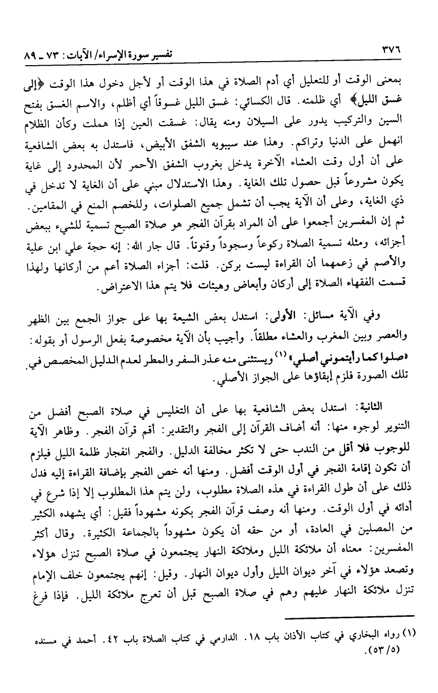 ثم إن المفسرين أجمعوا على أن المراد بقرآن الفجر هو صلاة الصبح تسمية للشيء ببعض أجزائه، ومثله تسمية الصلاة ركوعا وسجودا وقنوتا. قال جار الله: إنه حجة علي ابن علية والأصم في زعمهما أن القراءة ليست بركن. قلت: أجزاء الصلاة أعم من أركانها ولهذا قسمت الفقهاء الصلاة إلى أركان وأبعاض وهيئات فلا يتم هذا الاعتراض.