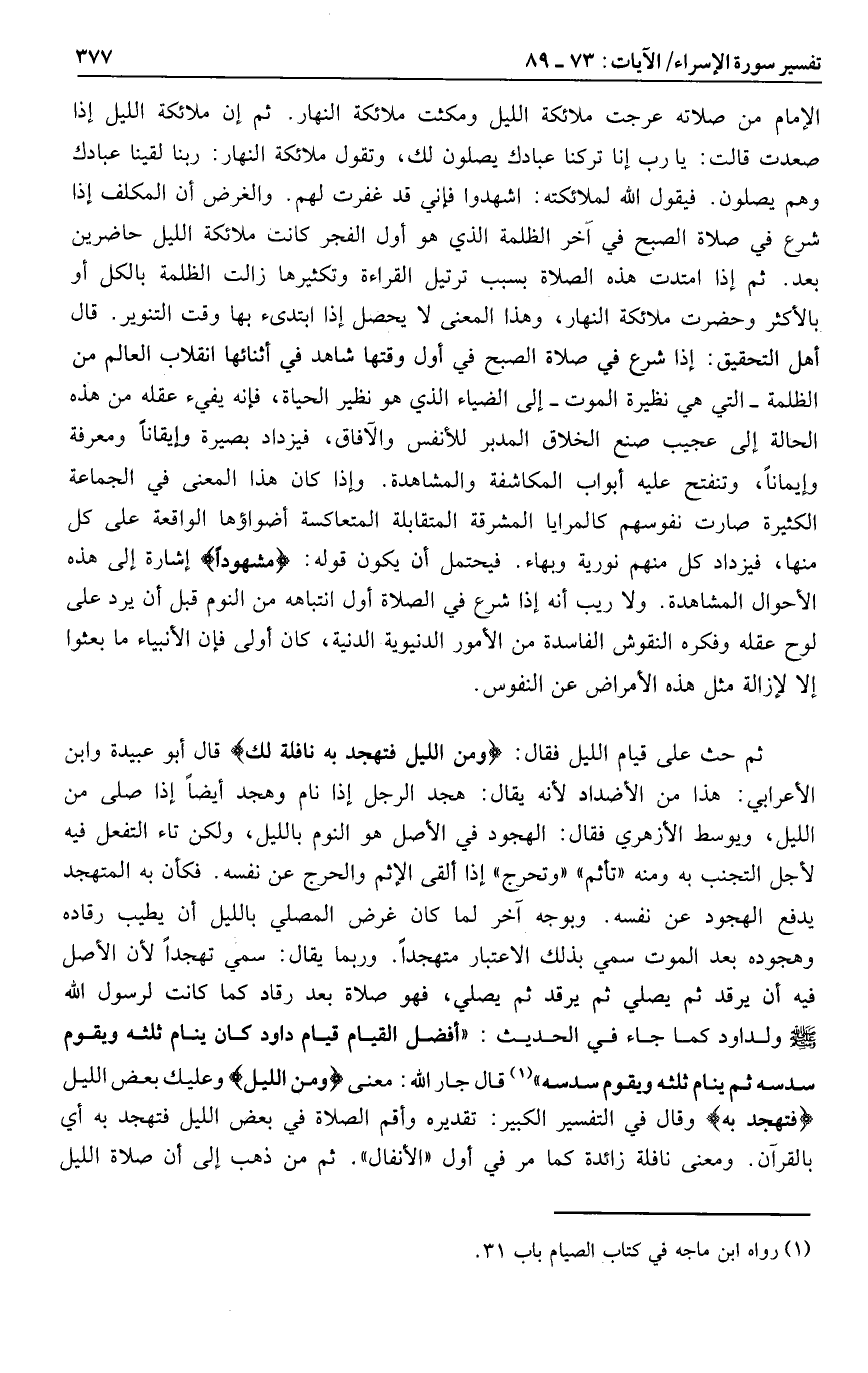 ثم حث على قيام الليل فقال: وَمِنَ اللَّيْلِ فَتَهَجَّدْ بِهِ نافِلَةً لَكَ قال أبو عبيدة وابن الأعرابي: هذا من الأضداد لأنه يقال: هجد الرجل إذا نام وهجد أيضا إذا صلى من الليل، ويوسط الأزهري فقال: الهجود في الأصل هو النوم بالليل، ولكن تاء التفعل فيه لأجل التجنب به ومنه «تأثم» «وتحرج» إذا ألقى الإثم والحرج عن نفسه. فكأن به المتهجد يدفع الهجود عن نفسه. وبوجه آخر لما كان غرض المصلي بالليل أن يطيب رقاده وهجوده بعد الموت سمي بذلك الاعتبار متهجدا. وربما يقال: سمي تهجدا لأن الأصل فيه أن يرقد ثم يصلي ثم يرقد ثم يصلي، فهو صلاة بعد رقاد كما كانت لرسول الله صلى الله عليه وسلم ولداود كما