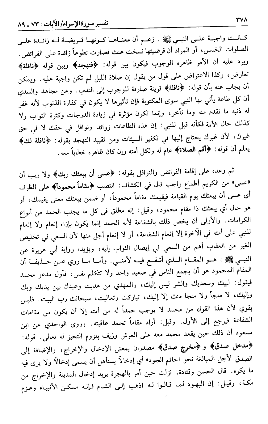 وأما ما روي عن حذيفة أن المقام المحمود هو أن يجمع الناس في صعيد واحد ولا تتكلم نفس، فأول مدعو محمد فيقول: لبيك وسعديك والشر ليس إليك، والمهدي من هديت وعبدك بين يديك وبك وإليك، لا ملجأ ولا منجا منك إلا إليك، تباركت وتعاليت، سبحانك رب البيت. فليس بقوي لأن هذا القول من محمد لا يوجب حمدا له من أمته إلا أن يكون من مقامات الشفاعة فيرجع إلى الأول. وقيل: أراد مقاما تحمد عاقبته. وروى الواحدي عن ابن مسعود أن ذلك حين يقعد محمد معه على العرش وزيف بلزوم التحيز له تعالى. قوله: