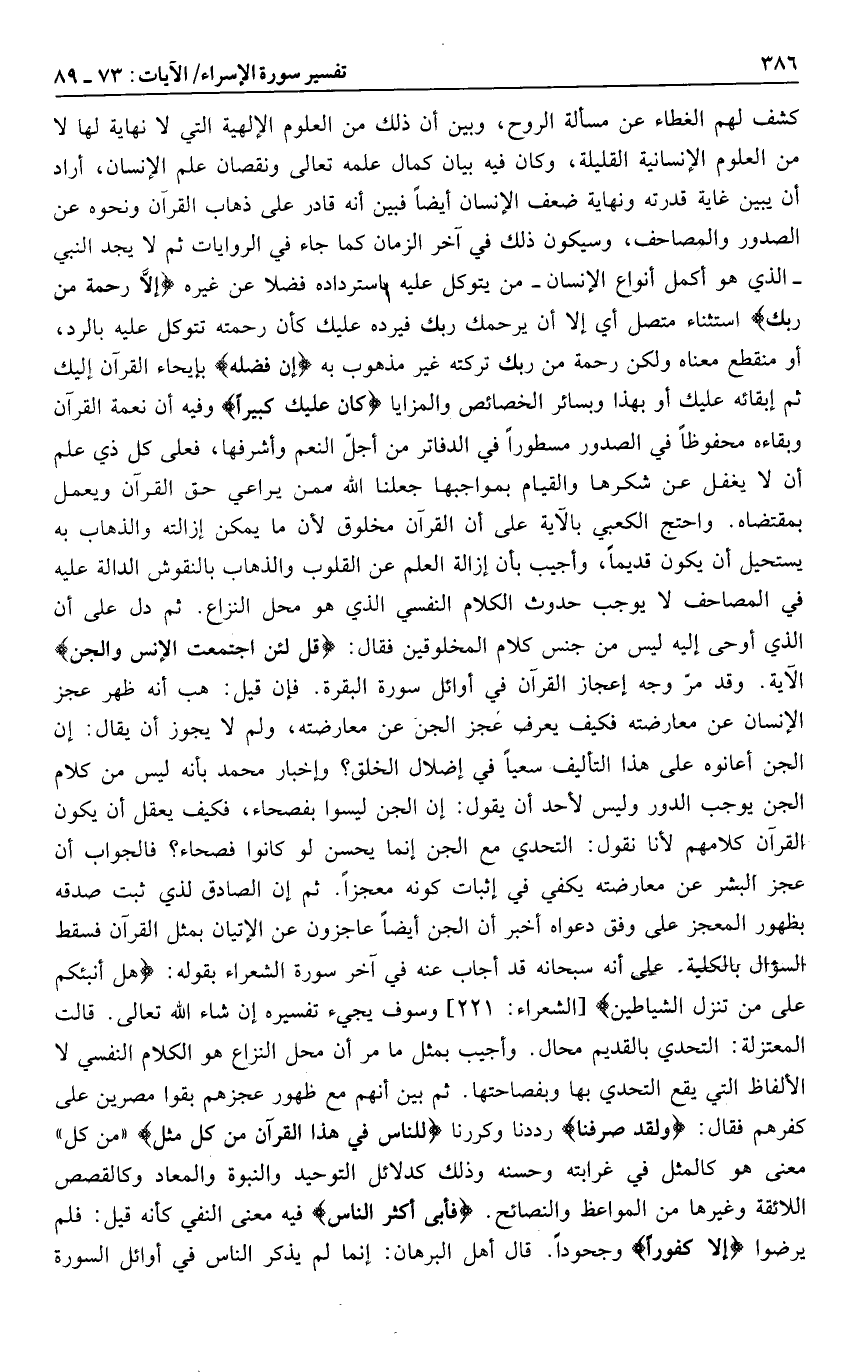 كشف لهم الغطاء عن مسألة الروح، وبين أن ذلك من العلوم الإلهية التي لا نهاية لها لا من العلوم الإنسانية القليلة، وكان فيه بيان كمال علمه تعالى ونقصان علم الإنسان، أراد أن يبين غاية قدرته ونهاية ضعف الإنسان أيضا فبين أنه قادر على ذهاب القرآن ونحوه عن الصدور والمصاحف، وسيكون ذلك في آخر الزمان كما جاء في الروايات ثم لا يجد النبي- الذي هو أكمل أنواع الإنسان- من يتوكل عليه باسترداده فضلا عن غيره إِلَّا رَحْمَةً مِنْ رَبِّكَ استثناء متصل أي إلا أن يرحمك ربك فيرده عليك كأن رحمته تتوكل عليه بالرد، أو منقطع معناه ولكن رحمة من ربك تركته غير مذهوب به إِنَّ فَضْلَهُ بإيحاء القرآن إليك ثم إبقائه عليك أو بهذا وبسائر الخصائص والمزايا كانَ عَلَيْكَ كَبِيراً وفيه أن نعمة القران وبقاءه محفوظا في الصدور مسطورا في الدفاتر من أجلّ النعم وأشرفها، فعلى كل ذي علم أن لا يغفل عن شكرها والقيام بمواجبها جعلنا الله ممن يراعي حق القرآن ويعمل بمقتضاه. واحتج الكعبي بالآية على أن القرآن مخلوق لأن ما يمكن إزالته والذهاب به يستحيل أن يكون قديما، وأجيب بأن إزالة العلم عن القلوب والذهاب بالنقوش الدالة عليه في المصاحف لا يوجب حدوث الكلام النفسي الذي هو محل النزاع. ثم دل على أن الذي أوحي إليه ليس من جنس كلام المخلوقين فقال: قُلْ لَئِنِ اجْتَمَعَتِ الْإِنْسُ وَالْجِنُّ الآية. وقد مرّ وجه إعجاز القرآن في أوائل سورة البقرة. فإن قيل: هب أنه ظهر عجز الإنسان عن معارضته فكيف يعرف عجز الجن عن معارضته، ولم لا يجوز أن يقال: إن الجن أعانوه على هذا التأليف سعيا في إضلال الخلق؟ وإخبار محمد بأنه ليس من كلام الجن يوجب الدور وليس لأحد أن يقول: إن الجن ليسوا بفصحاء، فكيف يعقل أن يكون القرآن كلامهم لأنا نقول: التحدي مع الجن إنما يحسن لو كانوا فصحاء؟ فالجواب أن عجز البشر عن معارضته يكفي في إثبات كونه معجزا. ثم إن الصادق الذي ثبت صدقه بظهور المعجز على وفق دعواه أخبر أن الجن أيضا عاجزون عن الإتيان بمثل القرآن فسقط السؤال بالكلية. على أنه سبحانه قد أجاب عنه في آخر سورة الشعراء بقوله: هَلْ أُنَبِّئُكُمْ عَلى مَنْ تَنَزَّلُ الشَّياطِينُ [الشعراء: 221] وسوف يجيء تفسيره إن شاء الله تعالى. قالت المعتزلة: التحدي بالقديم محال. وأجيب بمثل ما مر أن محل النزاع هو الكلام النفسي لا الألفاظ التي يقع التحدي بها وبفصاحتها. ثم بين أنهم مع ظهور عجزهم بقوا مصرين على كفرهم فقال: وَلَقَدْ صَرَّفْنا رددنا وكررنا لِلنَّاسِ فِي هذَا الْقُرْآنِ مِنْ كُلِّ مَثَلٍ «من كل» معنى هو كالمثل في غرابته وحسنه وذلك كدلائل التوحيد والنبوة والمعاد وكالقصص اللائقة وغيرها من المواعظ والنصائح. فَأَبى أَكْثَرُ النَّاسِ فيه معنى النفي كأنه قيل: فلم يرضوا إِلَّا كُفُوراً وجحودا. قال أهل البرهان: إنما لم يذكر الناس في أوائل السورة