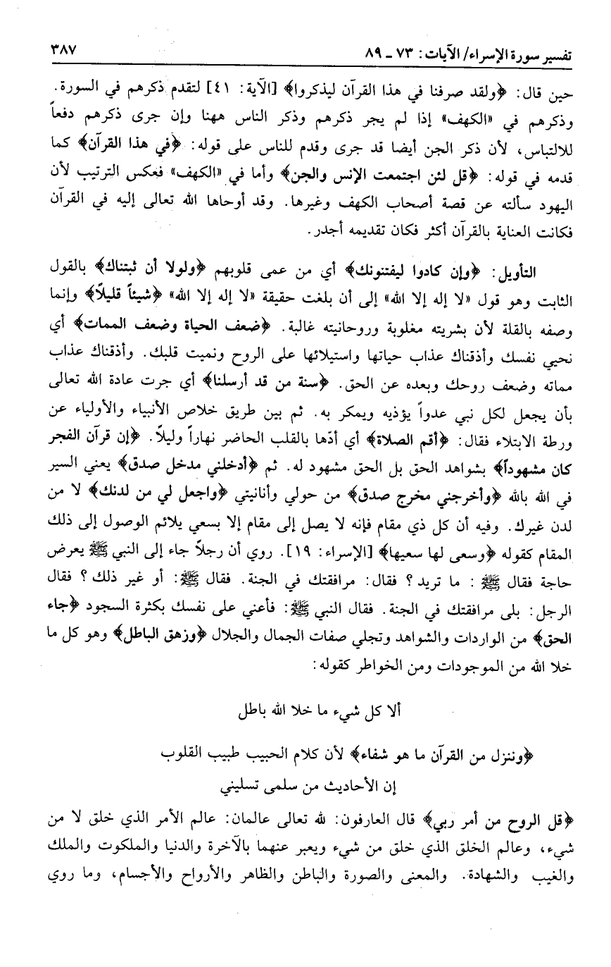 ألا كل شيء ما خلا الله باطل وَنُنَزِّلُ مِنَ الْقُرْآنِ ما هُوَ شِفاءٌ لأن كلام الحبيب طبيب القلوب إن الأحاديث من سلمى تسليني قُلِ الرُّوحُ مِنْ أَمْرِ رَبِّي قال العارفون: لله تعالى عالمان: عالم الأمر الذي خلق لا من شيء، وعالم الخلق الذي خلق من شيء ويعبر عنهما بالآخرة والدنيا والملكوت والملك والغيب والشهادة. والمعنى والصورة والباطن والظاهر والأرواح والأجسام، وما