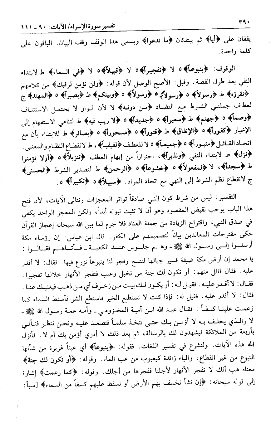 يَنْبُوعاً هـ لا تَفْجِيراً هـ لا قَبِيلًا هـ لا فِي السَّماءِ ط لابتداء النفي بعد طول القصة. وقيل: الأصح الوصل لأن قوله: وَلَنْ نُؤْمِنَ لِرُقِيِّكَ من كلامهم نَقْرَؤُهُ ط رَسُولًا هـ رَسُولًا هـ رَسُولًا هـ وَبَيْنَكُمْ ط بَصِيراً هـ الْمُهْتَدِ ج لعطف جملتي الشرط مع التضاد مِنْ دُونِهِ لا لأن الواو لا يحتمل الاستئناف وَصُمًّا هـ جَهَنَّمُ ط سَعِيراً هـ جَدِيداً هـ لا رَيْبَ فِيهِ ط لتناهي الاستفهام إلى الإخبار كُفُوراً هـ الْإِنْفاقِ ط قَتُوراً هـ مَسْحُوراً هـ بَصائِرَ ط للابتداء بأن مع اتحاد القائل مَثْبُوراً هـ جَمِيعاً هـ لا للعطف لَفِيفاً، ط لانقطاع النظام والمعنى.