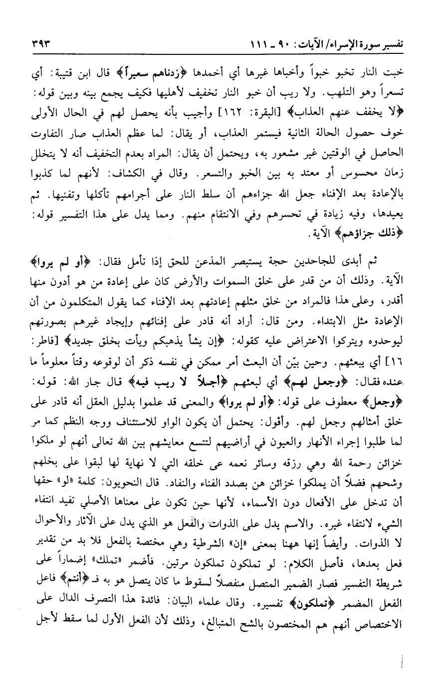 وَجَعَلَ معطوف على قوله: أَوَلَمْ يَرَوْا والمعنى قد علموا بدليل العقل أنه قادر على خلق أمثالهم وجعل لهم. وأقول: يحتمل أن يكون الواو للاستئناف ووجه النظم كما مر لما طلبوا إجراء الأنهار والعيون في أراضيهم لتتسع معايشهم بين الله تعالى أنهم لو ملكوا خزائن رحمة الله وهي رزقه وسائر نعمه عى خلقه التي لا نهاية لها لبقوا على بخلهم وشحهم فضلا أن يملكوا خزائن هن بصدد الفناء والنفاد. قال النحويون: كلمة «لو» حقها أن تدخل على الأفعال دون الأسماء، لأنها حين تكون على معناها الأصلي تفيد انتفاء الشيء لانتفاء غيره. والاسم يدل على الذوات والفعل هو الذي يدل على الآثار والأحوال لا الذوات. وأيضا إنها هاهنا بمعنى «إن» الشرطية وهي مختصة بالفعل فلا بد من تقدير فعل بعدها، فأصل الكلام: لو تملكون تملكون مرتين. فأضمر «تملك» إضمارا على شريطة التفسير فصار الضمير المتصل منفصلا لسقوط ما كان يتصل هو به ف أَنْتُمْ فاعل الفعل المضمر تَمْلِكُونَ تفسيره. وقال علماء البيان: فائدة هذا التصرف الدال على الاختصاص أنهم هم المختصون بالشح المتبالغ، وذلك لأن الفعل الأول لما سقط لأجل