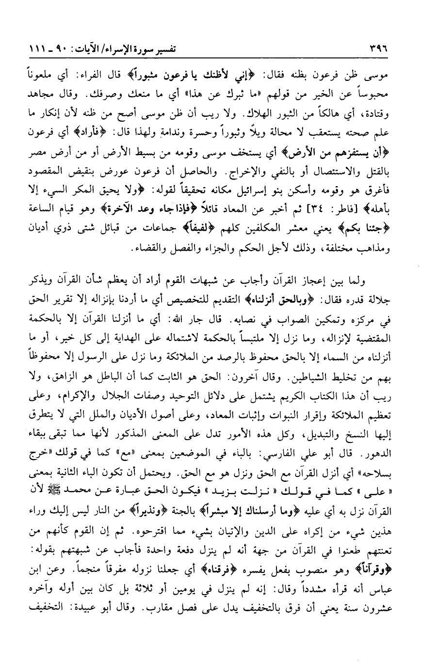 ولما بين إعجاز القرآن وأجاب عن شبهات القوم أراد أن يعظم شأن القرآن ويذكر جلالة قدره فقال: وَبِالْحَقِّ أَنْزَلْناهُ التقديم للتخصيص أي ما أردنا بإنزاله إلا تقرير الحق في مركزه وتمكين الصواب في نصابه. قال جار الله: أي ما أنزلنا القرآن إلا بالحكمة المقتضية لإنزاله، وما نزل إلا ملتبسا بالحكمة لاشتماله على الهداية إلى كل خير، أو ما أنزلناه من السماء إلا بالحق محفوظ بالرصد من الملائكة وما نزل على الرسول إلا محفوظا بهم من تخليط الشياطين. وقال آخرون: الحق هو الثابت كما أن الباطل هو الزاهق، ولا ريب أن هذا الكتاب الكريم يشتمل على دلائل التوحيد وصفات الجلال والإكرام، وعلى تعظيم الملائكة وإقرار النبوات وإثبات المعاد، وعلى أصول الأديان والملل التي لا يتطرق إليها النسخ والتبديل، وكل هذه الأمور تدل على المعنى المذكور لأنها مما تبقى ببقاء الدهور. قال أبو علي الفارسي: بالباء في الموضعين بمعنى «مع» كما في قولك «خرج بسلاحه» أي أنزل القرآن مع الحق ونزل هو مع الحق. ويحتمل أن تكون الباء الثانية بمعنى «على» كما في قولك «نزلت بزيد» فيكون الحق عبارة عن محمد صلى الله عليه وآله لأن القرآن نزل به أي عليه وَما أَرْسَلْناكَ إِلَّا مُبَشِّراً بالجنة وَنَذِيراً من النار ليس إليك وراء هذين شيء من إكراه على الدين والإتيان بشيء مما اقترحوه. ثم إن القوم كأنهم من تعنتهم طعنوا في القرآن من جهة أنه لم ينزل دفعة واحدة فأجاب عن شبهتهم بقوله: