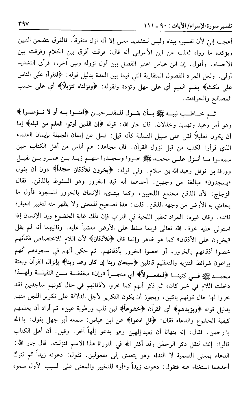 ثم خاطب نبيه صلى الله عليه وسلم بأن يقول للمقترحين آمِنُوا بِهِ أَوْ لا تُؤْمِنُوا وهو أمر وعيد وتهديد وخذلان. قال جار الله: قوله إِنَّ الَّذِينَ أُوتُوا الْعِلْمَ مِنْ قَبْلِهِ إما أن يكون تعليلا لقل على سبيل التسلية كأنه قيل: تسل عن إيمان الجهلة بإيمان العلماء الذي قرأوا الكتب من قبل نزول القرآن. قال مجاهد: هم أناس من أهل الكتاب حين سمعوا ما أنزل على محمد صلى الله عليه وسلم خروا وسجدوا منهم زيد بن عمرو بن نفيل وورقة بن نوفل وعبد الله بن سلام. وفي قوله: يَخِرُّونَ لِلْأَذْقانِ سُجَّداً دون أن يقول «يسجدون» مبالغة من وجهين: أحدهما أنه قيد الخرور وهو السقوط بالذقن. فقال الزجاج: لأن الذقن مجتمع اللحيين، وكما يبتدىء الإنسان بالخرور للسجود فأول ما يحاذي به الأرض من وجهه الذقن. قلت: هذا تصحيح للمعنى ولا يظهر منه لتغيير العبارة فائدة. وقال غيره: المراد تعفير اللحية في التراب فإن ذلك غاية الخضوع وإن الإنسان إذا استولى عليه خوف الله تعالى فربما سقط على الأرض مغشيا عليه. وثانيهما أنه لم يقل «يخرون على الأذقان» كما هو ظاهر وإنما قال لِلْأَذْقانِ لأن اللام للاختصاص فكأنهم خصوا أذقانهم بالخرور، أو خصوا الخرور بأذقانهم. ثم حكى أنهم في سجودهم أنهم يراعون شرائط التنزيه والتعظيم قائلين سُبْحانَ رَبِّنا إِنْ كانَ وَعْدُ رَبِّنا بإنزال القرآن وبعثة محمد صلى الله عليه وسلم في كتبنا لَمَفْعُولًا أي منجرا «وإن» مخففة من الثقيلة ولهذا دخلت اللام في خبر كان، ثم ذكر أنهم كما خروا لأذقانهم في حال كونهم ساجدين فقد خروا لها حال كونهم باكين، ويجوز أن يكون التكرير لأجل الدلالة على تكرير الفعل منهم بدليل قوله وَيَزِيدُهُمْ أي القرآن خُشُوعاً لين قلب ورطوبة عين، ثم أراد أن يعلمهم كيفية الخشوع والدعاء فقال: قُلِ ادْعُوا عن ابن عباس: سمعه أبو جهل يقول: يا الله يا رحمن. فقال: إنه ينهانا أن نعبد إلهين وهو يدعو إلها آخر. وقيل: أن أهل الكتاب قالوا: إنك لتقل ذكر الرحمن وقد أكثر الله في التوراة هذا الاسم فنزلت. قال جار الله: