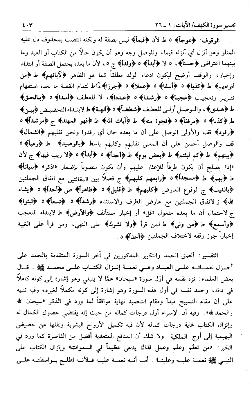 عِوَجاً هـ ط لأن قَيِّماً ليس بصفة له ولكنه انتصب بمحذوف دل عليه المتلو وهو أنزل أي أنزله قيما، وللوصل وجه وهو أن يكون حالا من الكتاب أو العبد وما بينهما اعتراض حَسَناً، هـ لا أَبَداً هـ وَلَداً ج هـ، لأن ما بعده يحتمل الصفة أو ابتداء وإخبار، والوقف أوضح ليكون ادعاء الولد مطلقا كما هو الظاهر لِآبائِهِمْ ط مِنْ أَفْواهِهِمْ ط كَذِباً هـ أَسَفاً هـ عَمَلًا هـ جُرُزاً، ط لتمام القصة ما بعده استفهام تقرير وتعجيب عَجَباً هـ رَشَداً هـ عَدَداً، لا للعطف أَمَداً هـ بِالْحَقِّ ط هُدىً، والوصل أولى للعطف شَطَطاً هـ آلِهَةً ط لابتداء التحضيض بَيِّنٍ ط كَذِباً هـ مِرفَقاً هـ فَجْوَةٍ مِنْهُ ط آياتِ اللَّهِ ط فَهُوَ الْمُهْتَدِ ج مُرْشِداً هـ رُقُودٌ قف والأولى الوصل على أن ما بعده حال أي رقدوا ونحن نقلبهم الشِّمالِ قف والوصل أحسن على أن المعنى نقلبهم وكلبهم باسط بِالْوَصِيدِ ط رُعْباً هـ بَيْنَهُمْ ط كَمْ لَبِثْتُمْ ط بَعْضَ يَوْمٍ ط أَحَداً هـ أَبَداً هـ لا رَيْبَ فِيها ج لأن «إذ» يصلح أن يكون طرفا للإعثار عليهم وأن يكون منصوبا بإضمار «اذكر» بُنْياناً ط بِهِمْ ط مَسْجِداً هـ رابِعُهُمْ كَلْبُهُمْ ج فصلا بين المقالتين مع اتفاق الجملتين بِالْغَيْبِ ج لوقوع العارض كَلْبُهُمْ ط قَلِيلٌ هـ ظاهِراً ص أَحَداً هـ يَشاءَ اللَّهُ ز لاتفاق الجملتين مع عارض الظرف والاستثناء رَشَداً هـ تِسْعاً هـ لَبِثُوا ج لاحتمال أن ما بعده مفعول «قل» أو إخبار مستأنف وَالْأَرْضِ ط لابتداء التعجب وَأَسْمِعْ ط مِنْ وَلِيٍّ ط لمن قرأ ولا تشرك على النهي، ومن قرأ على الغيبة إخبارا جوز وقفه لاختلاف الجملتين أَحَداً هـ.