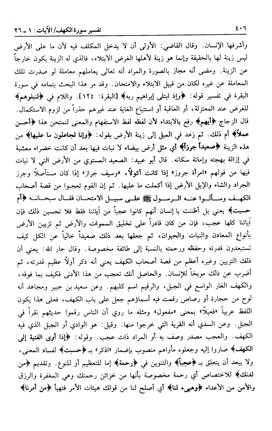 قال الزجاج أَيُّهُمْ رفع بالابتداء لأن لفظه لفظ الاستفهام والمعنى لنمتحن هذا أَحْسَنُ عَمَلًا أم ذلك. ثم زهد في الميل إلى زينة الأرض بقوله: وَإِنَّا لَجاعِلُونَ ما عَلَيْها من هذه الزينة صَعِيداً جُرُزاً أي مثل أرض بيضاء لا نبات فيها بعد أن كانت خضراء معشبة في إزالة بهجته وإمانة سكانه. قال أبو عبيد: الصعيد المستوي من الأرض التي لا نبات فيها من قولهم «امرأة جروز» إذا كانت أكولا، «وسيف جراز» إذا كان مستأصلا وجرز الجراد والشاء والإبل الأرض إذا أكملت ما عليها. ثم إن القوم تعجبوا من قصة أصحاب الكهف وسألوا عنه الرسول صلى الله عليه وسلم على سبيل الامتحان فقال سبحانه أَمْ حَسِبْتَ يعني بل أظننت يا إنسان أنهم كانوا عجبا من آياتنا فقط فلا تحسبن ذلك فإن آياتنا كلها عجب، فإن من كان قادرا على تخليق السموات والأرض ثم تزيين الأرض بأنواع المعادن والنبات والحيوان، ثم جعلها بعد ذلك صعيدا خاليا عن الكل كيف تستبعدون قدرته وحفظه ورحمته بالنسبة إلى طائفة مخصوصة. وقال جار الله: يعني أن ذلك التزيين وغيره أعظم من قصة أصحاب الكهف يعني أنه ذكر أولا عظيم قدرته، ثم أضرب عن ذلك موبخا للإنسان. والحاصل أنك تعجب من هذا الأدنى فكيف بما فوقه، والكهف الغار الواسع في الجبل، والرقيم اسم كلبهم. وعن سعيد بن جبير ومجاهد أنه لوح من حجارة أو رصاص رقمت فيه أسماؤهم جعل على باب الكهف، فعلى هذا يكون اللفظ عربيا «فعيلا» بمعنى «مفعول» ومثله ما روي أن الناس رقموا حديثهم نقرا في الجبل. وعن السدي أنه القرية التي خرجوا منها. وقيل: هو الوادي أو الجبل الذي فيه الكهف. والعجب مصدر وصف به أو المراد ذات عجب. وقوله: إِذْ أَوَى الْفِتْيَةُ إِلَى الْكَهْفِ صاروا إليه وجعلوه مأواهم منصوب بإضمار «اذكر» ب حَسِبْتَ لفساد المعنى، ولا يبعد أن يتعلق ب عَجَباً والتنوين في رَحْمَةً إما للتعظيم أو للنوع. وتقديم مِنْ لَدُنْكَ للاختصاص أي رحمة مخصوصة بأنها من خزائن رحمتك وهي المغفرة والرزق والأمن من الأعداء وَهَيِّئْ لَنا أي أصلح لنا من قولك هيئات الأمر فتهيأ مِنْ أَمْرِنا