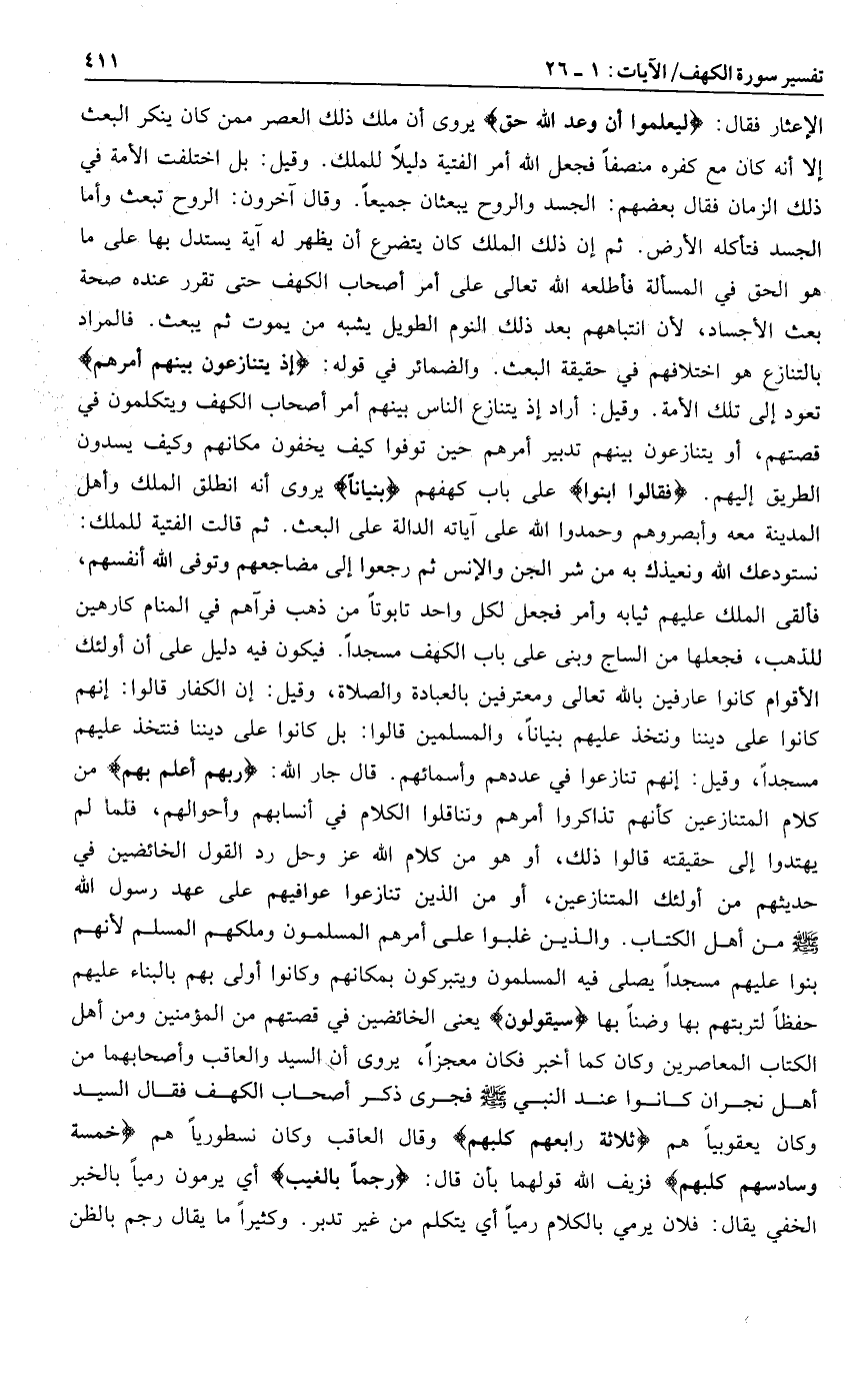 نستودعك الله ونعيذك به من شر الجن والإنس ثم رجعوا إلى مضاجعهم وتوفى الله أنفسهم، فألقى الملك عليهم ثيابه وأمر فجعل لكل واحد تابوتا من ذهب فرآهم في المنام كارهين للذهب، فجعلها من الساج وبنى على باب الكهف مسجدا. فيكون فيه دليل على أن أولئك الأقوام كانوا عارفين بالله تعالى ومعترفين بالعبادة والصلاة، وقيل: إن الكفار قالوا: إنهم كانوا على ديننا ونتخذ عليهم بنيانا، والمسلمين قالوا: بل كانوا على ديننا فنتخذ عليهم مسجدا، وقيل: إنهم تنازعوا في عددهم وأسمائهم. قال جار الله: رَبُّهُمْ أَعْلَمُ بِهِمْ من كلام المتنازعين كأنهم تذاكروا أمرهم وتناقلوا الكلام في أنسابهم وأحوالهم، فلما لم يهتدوا إلى حقيقته قالوا ذلك، أو هو من كلام الله عز وجل رد القول الخائضين في حديثهم من أولئك المتنازعين، أو من الذين تنازعوا عوافيهم على عهد رسول الله صلى الله عليه وسلم من أهل الكتاب. والذين غلبوا على أمرهم المسلمون وملكهم المسلم لأنهم بنوا عليهم مسجدا يصلى فيه المسلمون ويتبركون بمكانهم وكانوا أولى بهم بالبناء عليهم حفظا لتربتهم بها وضنا بها سَيَقُولُونَ يعنى الخائضين في قصتهم من المؤمنين ومن أهل الكتاب المعاصرين وكان كما أخبر فكان معجزا، يروى أن السيد والعاقب وأصحابهما من أهل نجران كانوا عند النبي صلى الله عليه وسلم فجرى ذكر أصحاب الكهف فقال السيد وكان يعقوبيا هم ثَلاثَةٌ رابِعُهُمْ كَلْبُهُمْ وقال العاقب وكان نسطوريا هم خَمْسَةٌ سادِسُهُمْ كَلْبُهُمْ فزيف الله قولهما بأن قال: رَجْماً بِالْغَيْبِ أي يرمون رميا بالخبر الخفي يقال: فلان يرمي بالكلام رميا أي يتكلم من غير تدبر. وكثيرا ما يقال رجم بالظن
